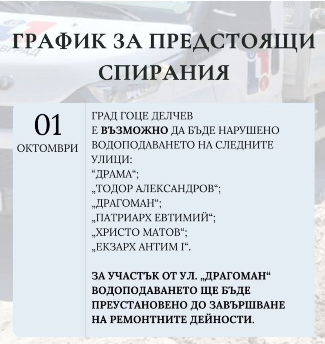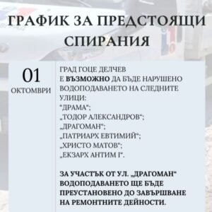 Днес, 1 октомври, „Водоснабдяване и канализация“ – Благоевград предупреждава за възможни смущения във водоподаването в град Гоце Делчев.