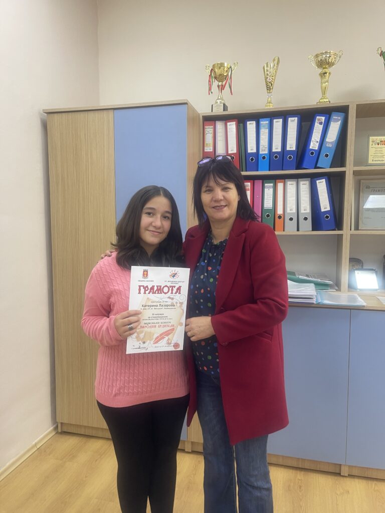 В раздел „Стихотворение“ първата награда завоюва Йордан Попов, ученик в 8. клас, с впечатляваща творба, отличаваща се с емоционална дълбочина и усет към художественото слово. Катерина Лазарова бе отличена с трето място, представяйки силно поетично послание, посветено на будителите – духовните стожери на българската култура.