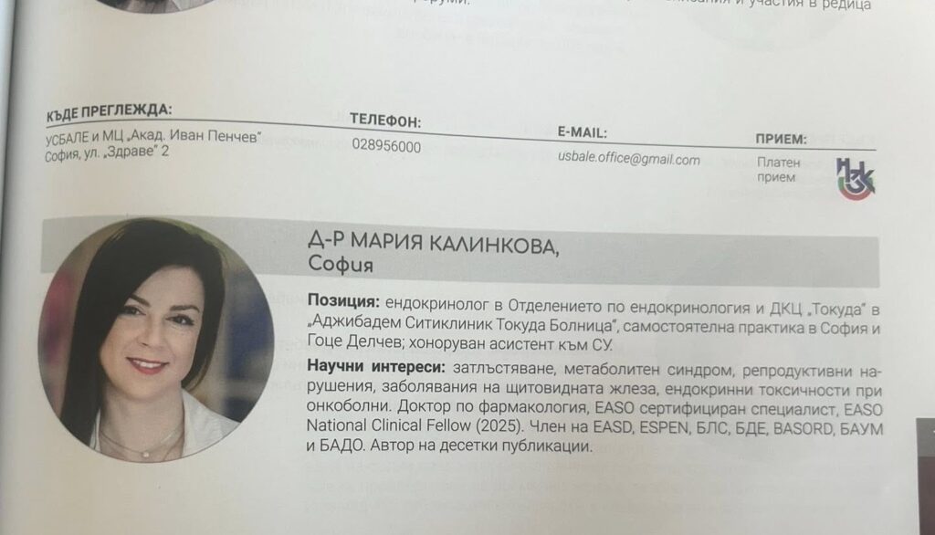 Д-р Калинкова е високо признат ендокринолог, практикуващ в две от водещите столични здравни заведения – „Аджибадем Ситиклиник Токуда Болница“ и ДКЦ „Токуда“. Нейната квалификация е безспорна: Доктор по фармакология, EASO сертифициран специалист, EASO National Clinical Fellow (2025) и хоноруван асистент към СУ.
