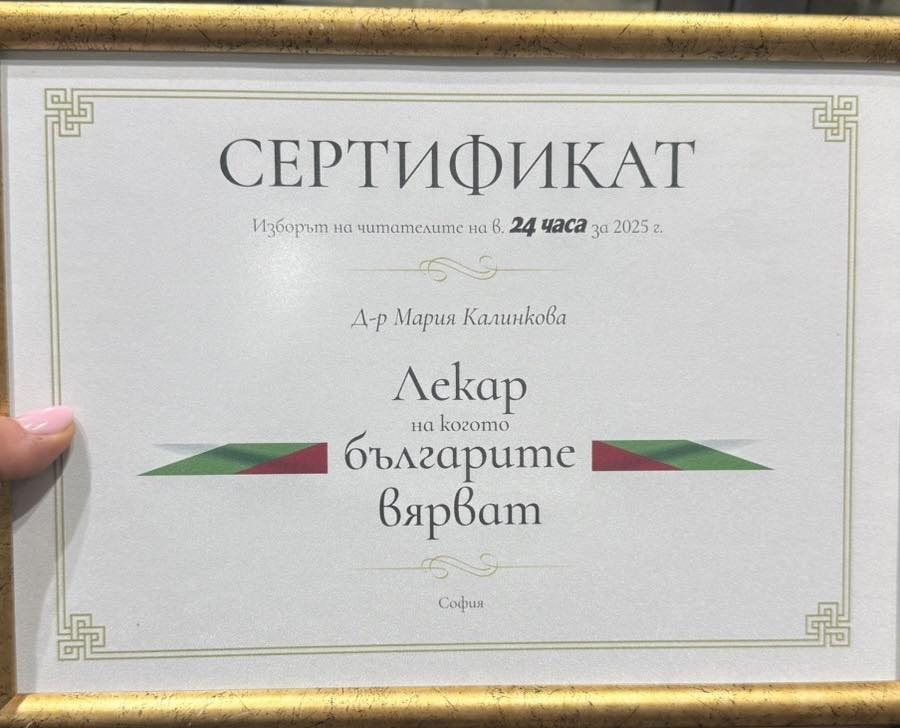 Сред имената, които получиха най-силното признание – Сертификат „Лекар, на когото българите вярват“ по избор на читателите на вестник „24 часа”, се нареди Д-р Мария Калинкова.