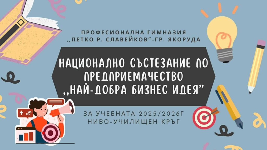 Професионална гимназия „Петко Рачов Славейков“ в град Якоруда бе домакин на училищния кръг от Националното състезание по предприемачество „Най-добра бизнес идея“, което даде възможност на учениците да демонстрират знания, креативност и предприемаческо мислене.