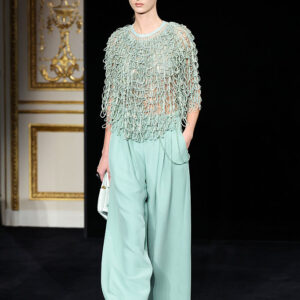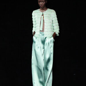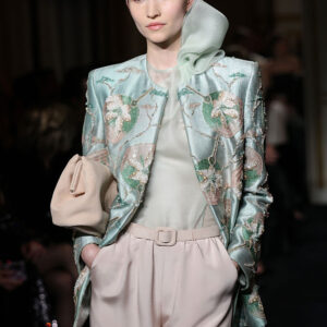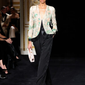 „Jade“ е вдъхновена от нефрита и носи усещане за спокойствие, чистота и ефирна елегантност. Палитрата беше доминирана от нежни зелени нюанси, бледа роза и перлено сиво, допълнени от фини кристални акценти, напомнящи блясъка на сурови минерали. Силуетите останаха верни на ДНК-то на Armani – изчистени, грациозни и луксозни, но с по-лек и съвременен прочит, видим в плавните панталони тип „палацо“, прозрачните органза ризи и изваяните рокли тип „колона“, украсени с ръчно изработени бродерии.