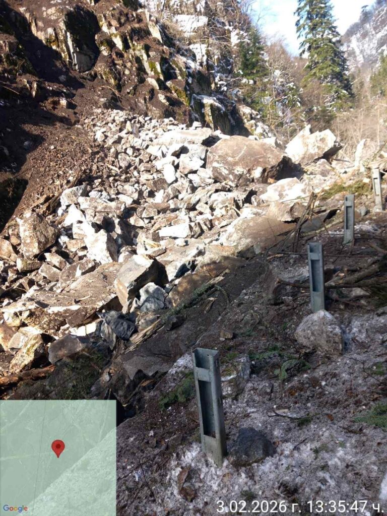 Път III-843 между Велинград и Сърница е временно затворен за движение заради паднала огромна скална маса. Срутването е станало при км 16+500, близо до местността „Дългия мост“.