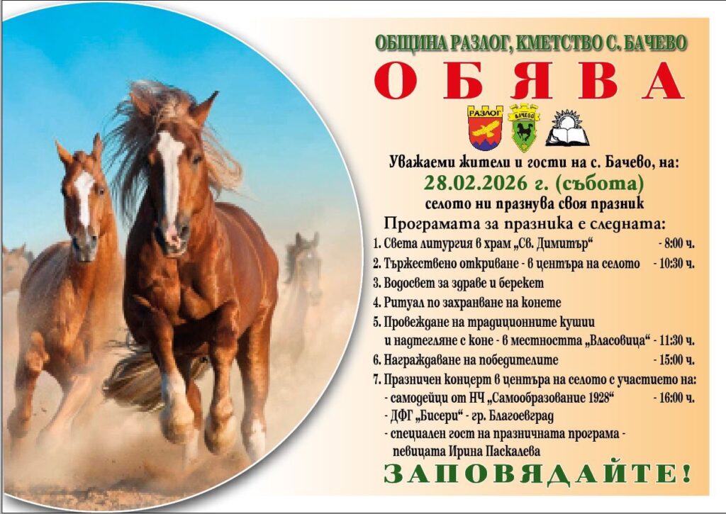 „Заповядайте в Бачево! Нека заедно споделим радостта от съхранените традиции и се насладим на неповторимата атмосфера на Тодоровден!“, призовават от Кметство Бачево и Община Разлог.