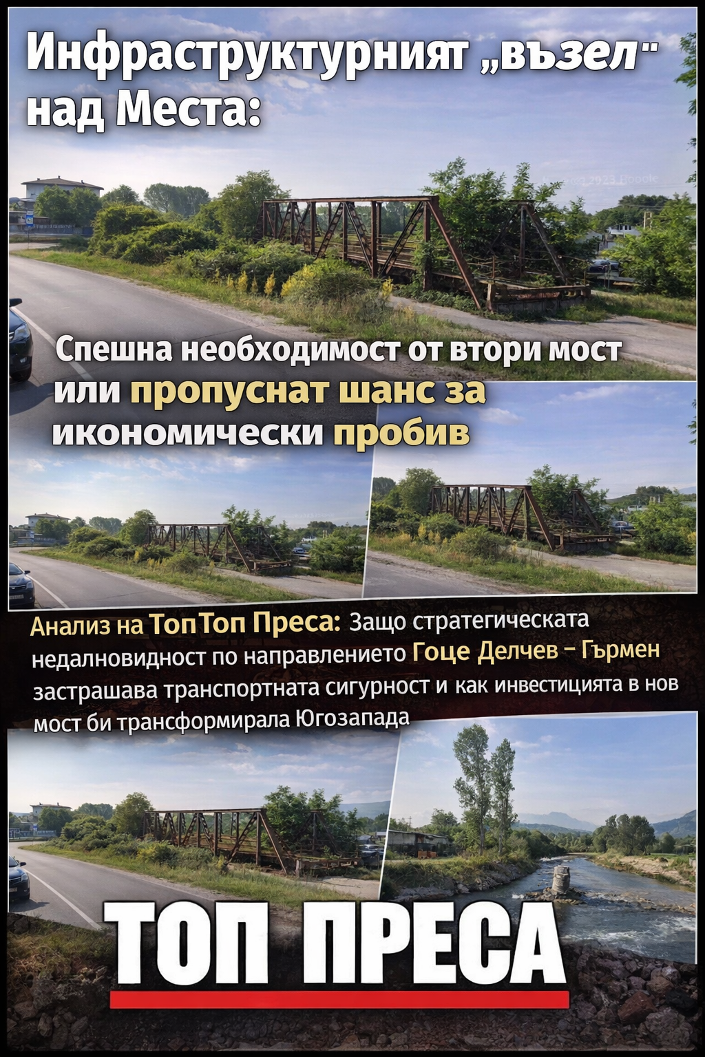 За да не остане темата само в сферата на пожелателната публицистика, Топ Преса призовава за незабавни действия от страна на местната власт и народните представители от региона. Ключът е в цифрите – необходимо е официално изискване на данни от АПИ за остатъчния експлоатационен ресурс на сегашния мост и провеждане на детайлно предпроектно проучване. Трябва да се анализира дали „немските“ фундаменти могат да бъдат интегрирани в нов проект, което би оптимизирало разходите по ЗУТ и би съкратило сроковете за изпълнение. Юридическата рамка позволява бързо задвижване на процедурите по ОВОС и хидроложките съгласувания с Басейнова дирекция, стига да има политическа воля. Вторият мост над Места не е лукс, а застраховка срещу бъдеща изолация. Инфраструктурата се гради днес, за да работи утре, и всяко отлагане е всъщност косвен данък, който жителите и бизнесът в Гоце Делчев и Гърмен плащат за липсата на държавна визия.