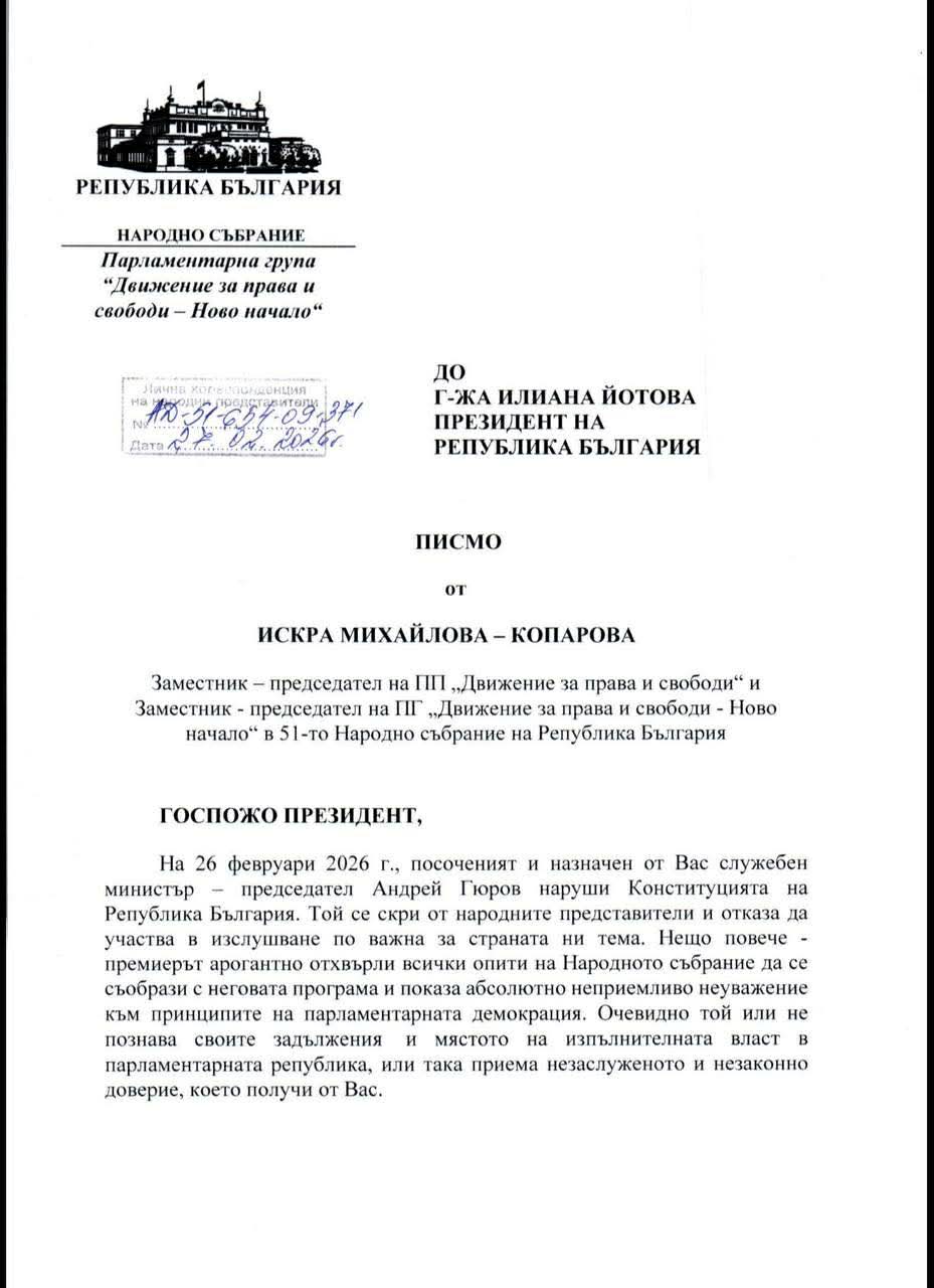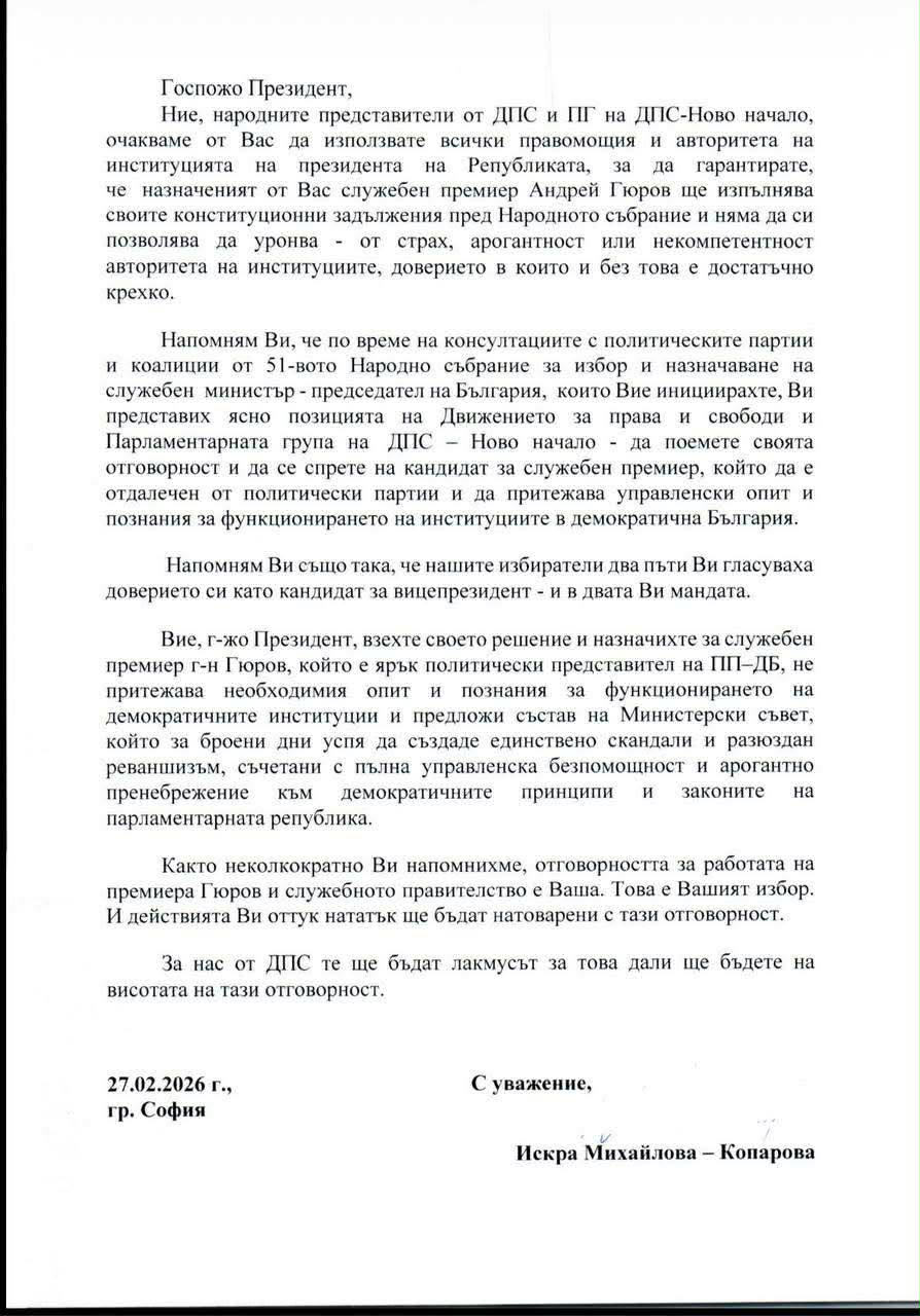 Поводът да се видим днес с вас е това, че днес в качеството ми на заместник-председател на партията Движение за права и свободи и на ПГ на ДПС-НОВО НАЧАЛО изпратих писмо на президента Илияна Йотова, с което ѝ обръщам внимание на това, което се разигра вчера в пленарната зала на Народното събрание на парламентарната република. Това обяви в Парламента Искра Михайлова, зам.-председател на ПГ на ДПС-НОВО НАЧАЛО.
