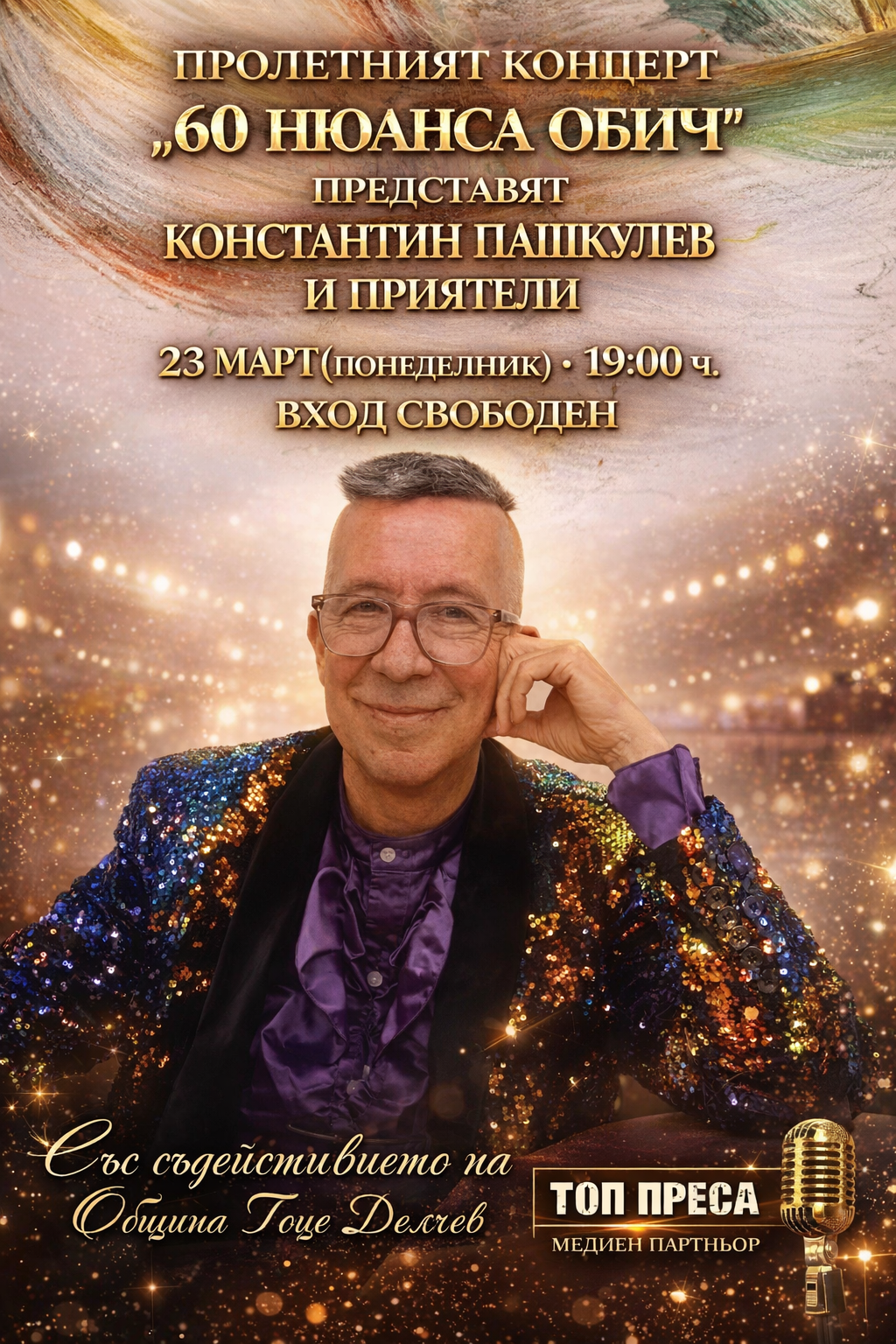 Когато пролетта почука на вратата със своя аромат на пробуждане, град Гоце Делчев се подготвя да отвори сърцето си за едно изключително културно събитие, което обещава да се превърне в истински празник на духа. Предстоящият концерт под наслов „60 нюанса обич“ не е просто поредната музикална проява в културния календар на общината, а дълбоко преживяване, изтъкано от мелодии, спомени и искрено творческо вдъхновение. В центъра на това артистично вълнение стои Константин Пашкулев, който заедно със своите верни приятели и съмишленици, подготвя спектакъл, чиято основна цел е да преведе публиката през богатата палитра на човешките чувства. Събитието, организирано със сърдечното съдействие на Община Гоце Делчев, е ярък пример за това как местната общност продължава да поддържа живи огъня на изкуството и традициите, пречупени през призмата на съвременната емоционалност. Като медия, която винаги пулсира с ритъма на региона, Топ Преса има честта да бъде генерален медиен партньор на този мащабен творчески проект. Нашата мисия е да споделим всеки миг от това вълшебство с вас, утвърждавайки за пореден път ангажимента си към значимите културни постижения на нашия град.