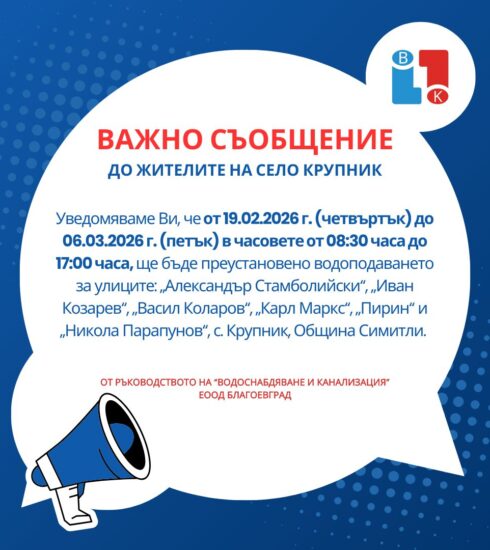 Жителите на село Крупник трябва да се подготвят за временно нарушение на водоподаването по редица улици, съобщават от местната...