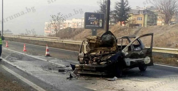 Както struma.bg писа, вследствие на сблъсъка автомобилът е пламнал, а пътуващите в него мъж и жена са откарани в благоевградската болница.