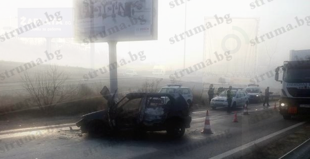 Лекият автомобил „Голф”, с благоевградска регистрация, който рано тази сутрин се удари жестоко в задната част на тир, с румънска регистрация, е изпепелен напълно.