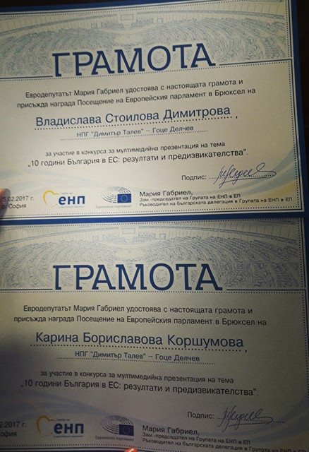 Голям успех за НПГ „Димитър Талев“ – двете единадесеттокласнички, Карина Коршумова и Владислава Димитрова, под ръководството на г-жа Марияна Белчева, бяха отличени сред 250 участници в конкурса организиран от евродепутата Мария Габриел „10 години България в ЕС- резултати и предизвикателства“. Двете момичета участваха с презентация и спечелиха голямата награда- посещение на европейския парламент в Брюксел. Награждаването се проведе на 25.02 в София, в Дома на Европа.