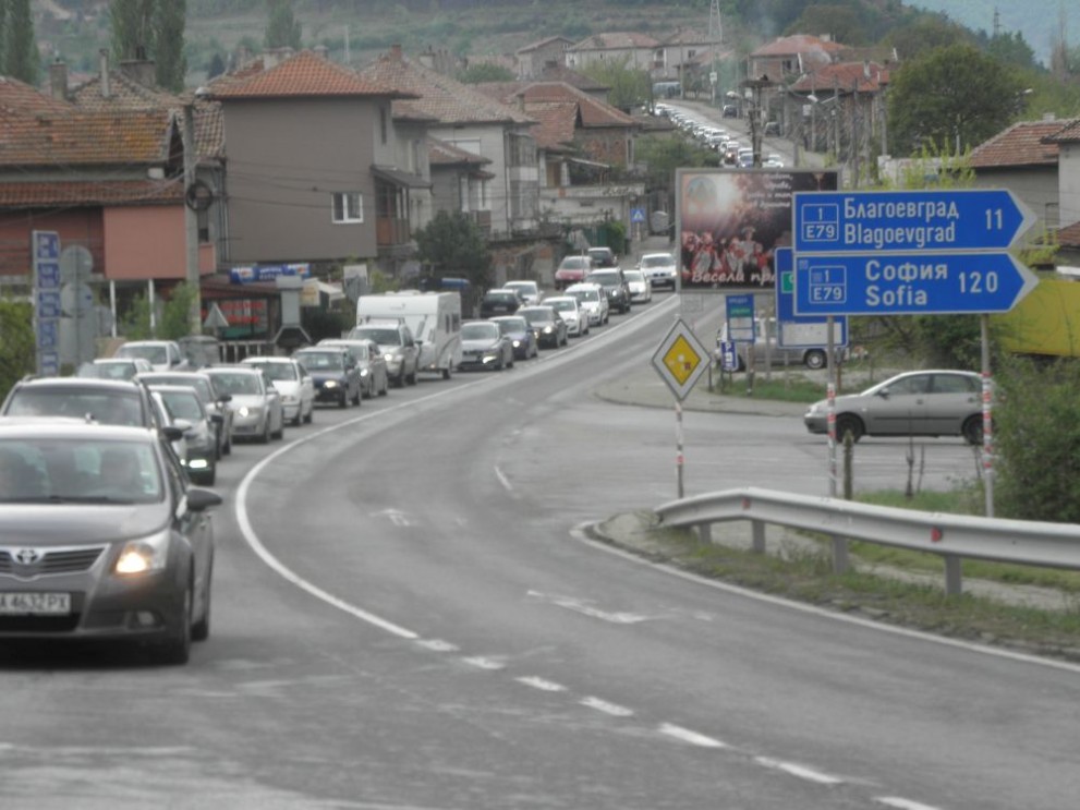 Тапа се образува към 13 ч. днес на Е-79 в района на град Симитли, където потокът от Банско, Разлог и Гоце Делчев се събира с този на завръщащите се от Сандански и ГКПП „Кулата-Промахон”, съобщава БГНЕС. При Симитли и двата трафика на завръщащите се към София в последния почивен ден за Великден, буквално спират. След около 5 минути той се раздвижва, но до входа на Благоевград колоната пълзи с около 35-40 км/час. Три екипа полицаи регулират и пропускат на етапи ту трафикът от Банско, ту другия, идващ откъм Кулата. Колони от автомобили, идващи откъм Банско е изпълнила „Дългата махала” на кв. Ораново на Симитли, така е и по Е-79 от Симитли до с. Черниче, за потокът от Кулата. След Благоевград трафикът се нормализира, за да продължи спокойно по АМ „Струма”.
