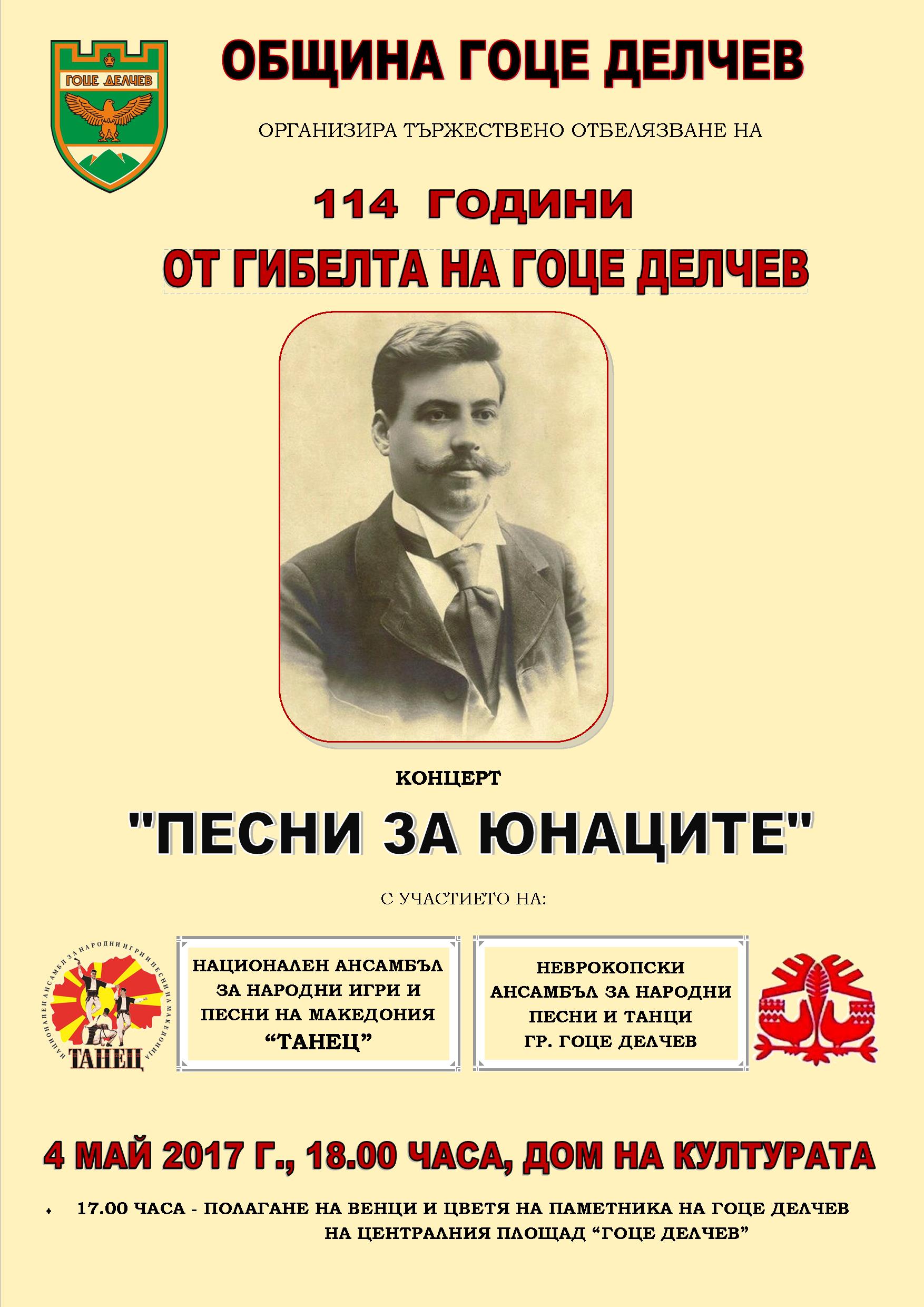 Община Гоце Делчев организира тържествено отбелязване на 114 години от гибелта на Гоце Делчев, което ще се състои на 4 май 2017 г. /четвъртък/