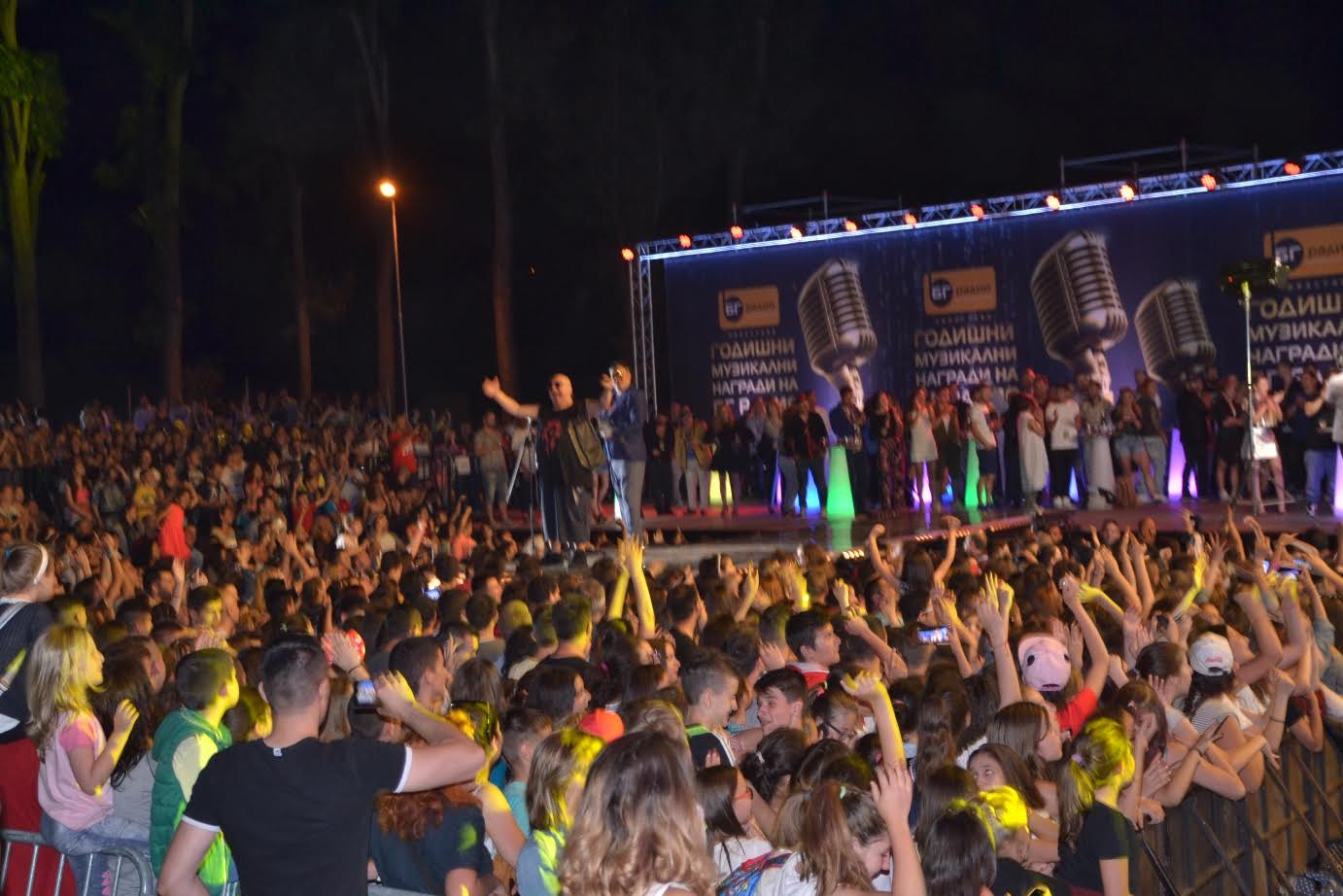 За първа година музикално събитие № 1 за България се проведе на ново място- парк „Македония“ / района бившите казарми/. Над 30 хиляди души станаха част от истинско музикално шоу. Събитието бе открито от благоевградските таланти „Rockids“. В ролята на водещ се превъплъти първият победител от музикалното риалити X Factor – чаровният Рафи. Но той беше сам, защото всички водещи на музикалните награди на България през тези 15 години на тяхното провеждане забавляваха публиката- Наско, Дичо, Део, Орлин Горанов, Любо Киров. Криско, Дара, Милен Данков, Павел и Венци Венц,Кристиян Костов, Михаела Маринова, Графа, Щрайх, Ралица, Михаела Филева и Venzy, КАФФЕ, Мариана Попова, Поли Генова, Индира, Авеню, Любо Киров, Миро, Б.Т.Р, DEEP ZONE PROJECT бяха само част от изпълнителите, които представиха новите си проекти.  Група Д2 пък припомни хита от първите БГ Радио награди- „Аз и ти“, заедно с талантите от “Rockids”. Сред големите изненади бе израелският  диджей Саги Абитбул с хита, завладял цял свят– Stanga и песента си с български мотиви от „Чичовите конье“ , която за първи път прозвуча и в Благоевград, България на живо. Той беше придружен от емблемата на Пиринския край- Ансамбъл „Пирин“ и уникалният танц на „Кукери“.