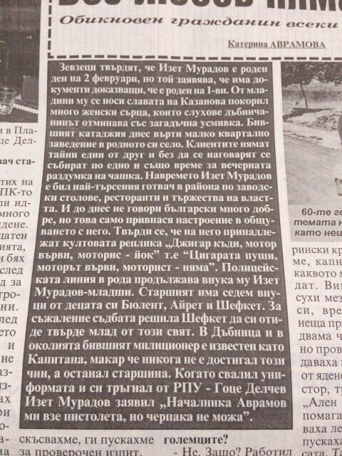 На времето Изер Мурадов е бил най-търсения готвач в района по заводски столове, ресторанти и тържества на властта. До последния си дъх той не е могъл да говори добре български език.