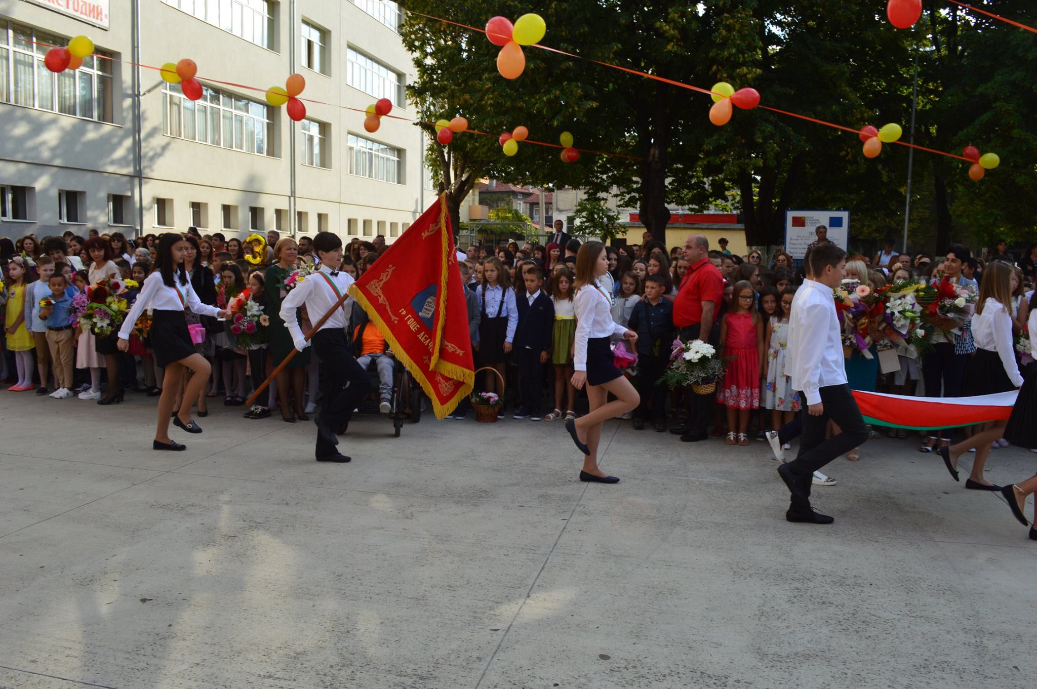 Вълнуващото събитие започна с посрещане на училищното знаме и издигане на националния флаг, под звуците на химна на Република България и химна на Европа.