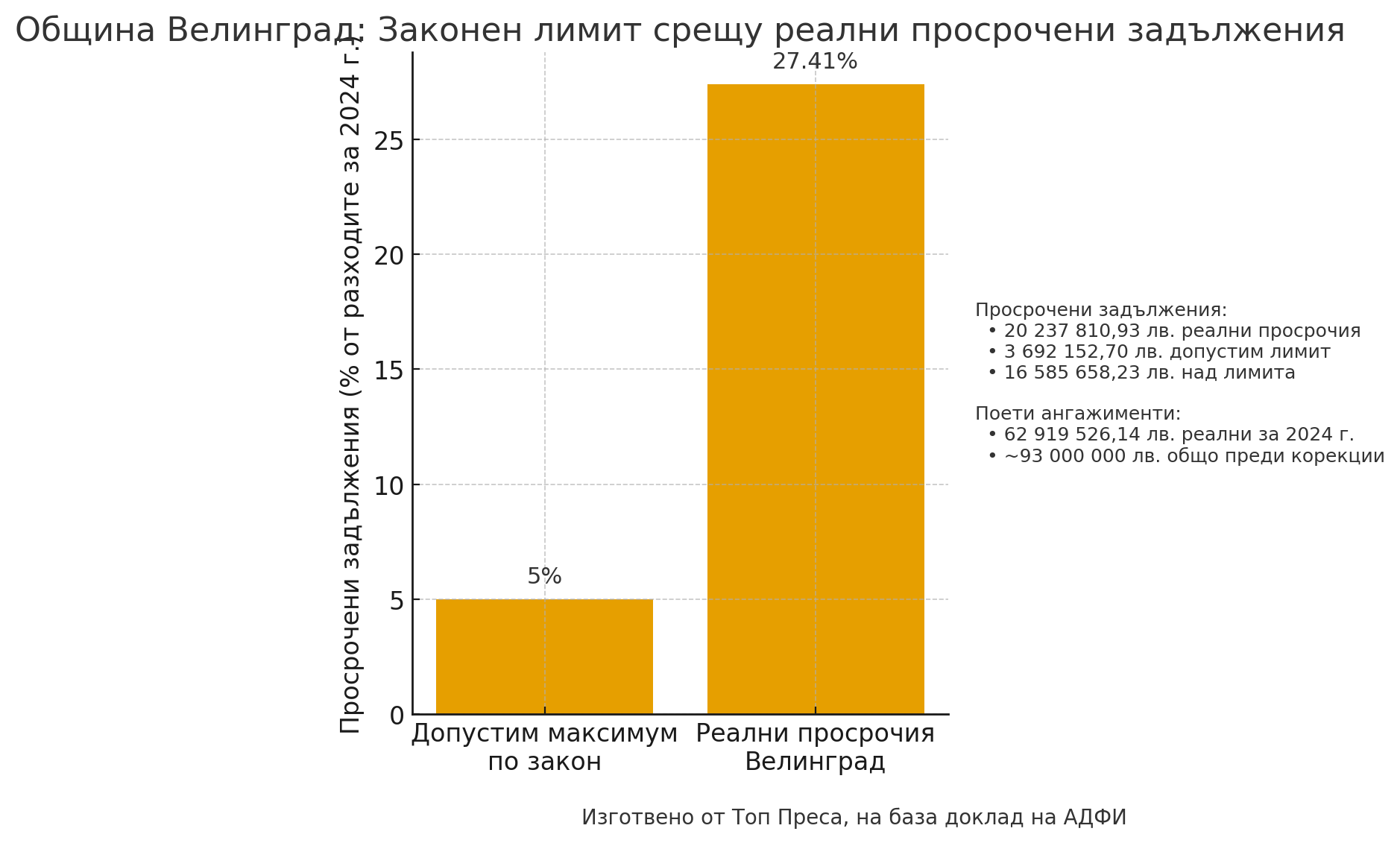 Истинският взрив обаче идва от просрочените задължения. Законът е ясен. Общината има право на просрочени задължения до 5% от разходите за последната година. За 2024 г. разходите на община Велинград са 73 845 954 лв. Допустимият размер на просрочени задължения е 3 692 152,70 лв. Реалността е следната. Просрочените задължения са 20 237 810,93 лв. Това са 27,41% при законово допустими 5%. Надвишението е 16 585 658,23 лв. Това не е просто нарушение. Това е официален индикатор за община в практическо състояние на фалит.