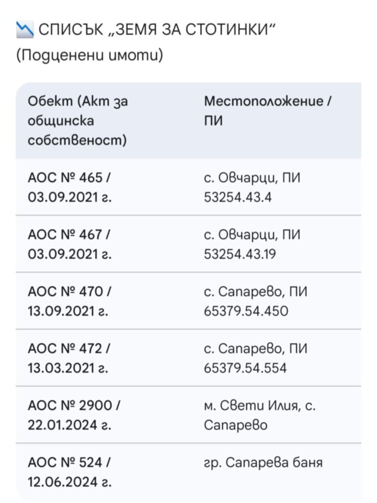 - ОКРЪЖНОСТТА НА БЕЗЦЕНИЦАТА:В с. Овчарци имоти от по 16 декара се водят по 01 лв./кв. м. През 2024 г. в гр. Сапарева баня нов имот от 18 733 кв. м. е оценен на едва 362 лева.