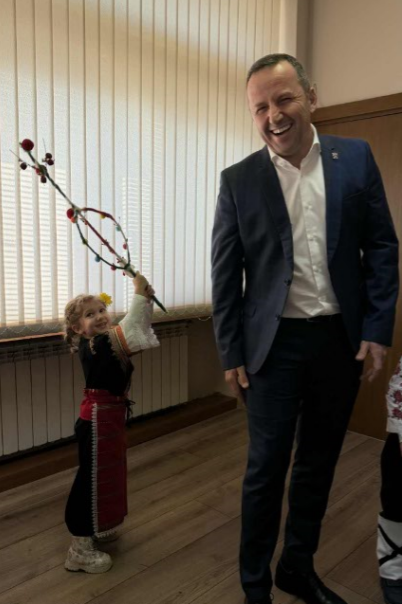 В навечерието на Коледа областният управител Георги Динев бе посетен от деца сурвакари от Детска градина №6 „Щастливо детство“, група „Слънчогледи“, Благоевград. Малките гости, заедно със своите учители г-жа Илиева и г-жа Станоева, както и директорът на детската градина г-жа Екатерина Янчева внесоха празничен дух и добро настроение в сградата на Областна администрация.
