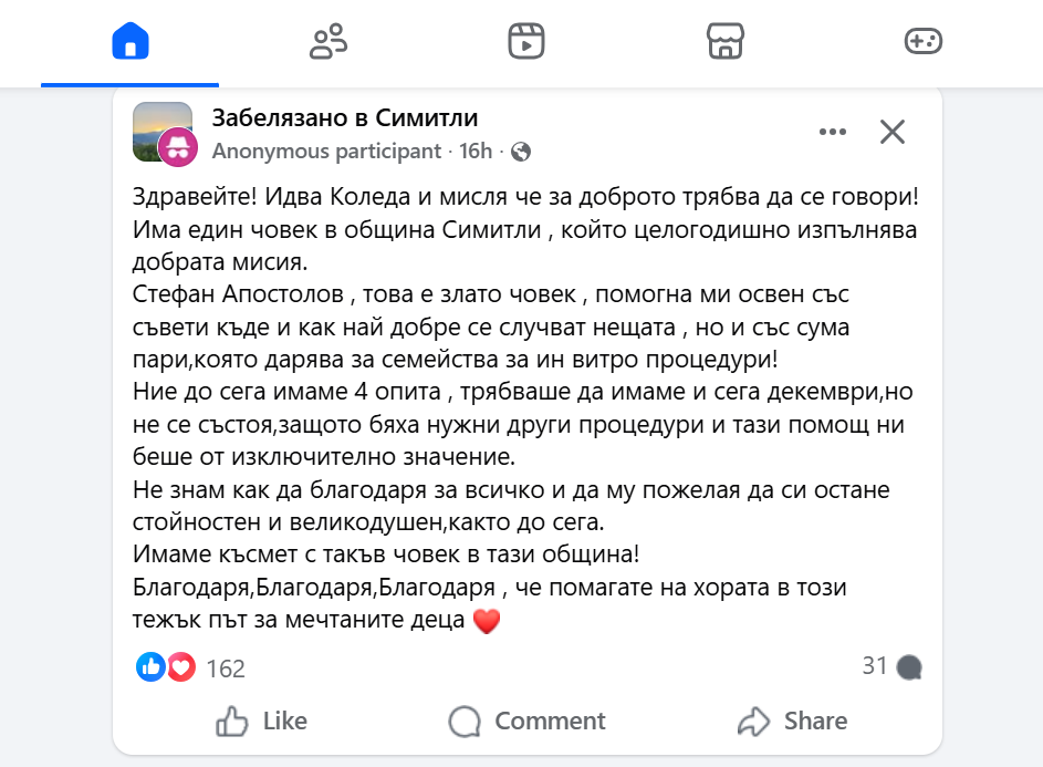 „Здравейте! Идва Коледа и мисля че за доброто трябва да се говори! Има един човек в община Симитли, който целогодишно изпълнява добрата мисия. Стефан Апостолов, това е злато човек, помогна ми освен със съвети къде и как най-добре се случват нещата, но и със сума пари, която дарява за семейства за ин витро процедури! Ние до сега имаме 4 опита, трябваше да имаме и сега декември, но не се състоя, защото бяха нужни други процедури и тази помощ ни беше от изключително значение. Не знам как да благодаря за всичко и да му пожелая да си остане стойностен и великодушен, както до сега. Имаме късмет с такъв човек в тази община! Благодаря, Благодаря, Благодаря, че помагате на хората в този тежък път за мечтаните деца.“