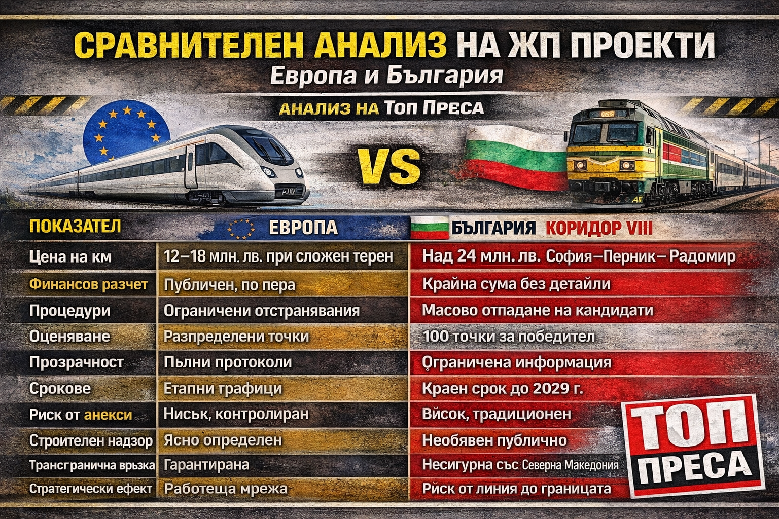 Железният път към Европа не минава само през тунели и мостове. Минава през прозрачност, контрол и ясни отговори. Докато те липсват, Коридор VIII остава проект с голям бюджет и неясен финал. Топ Преса ще продължи да следи. Защото общественият интерес не приключва с подписването на договор.