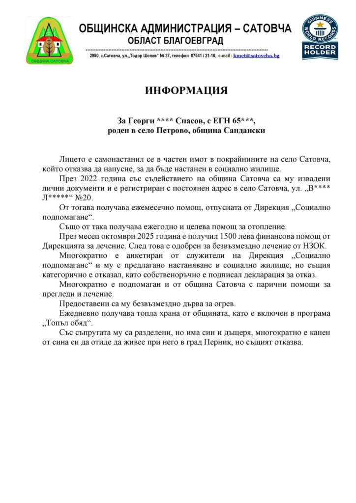 След вълната от емоции в социалните мрежи и силния апел на една прекрасна млада дама- Нели Зехирова, Топ Преса получи официална позиция от Община Сатовча. Документите хвърлят нова светлина върху случая с Георги Спасов и разкриват една сложна картина, в която човечността се сблъсква с правото на личен избор.