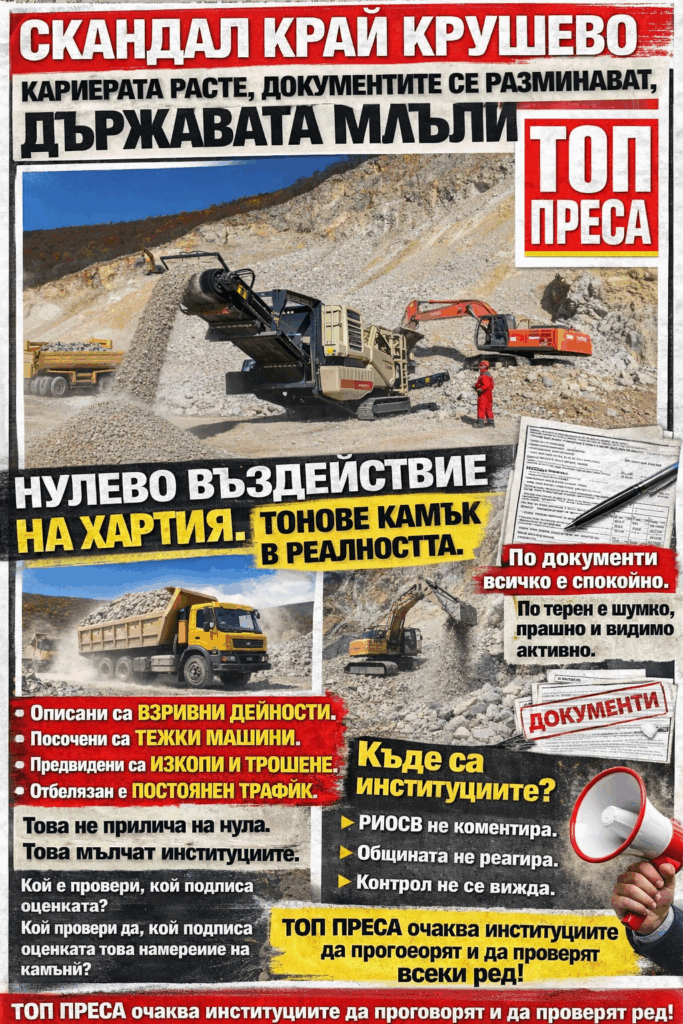 Затова вниманието на РИОСВ–Благоевград, МОСВ, Басейнова дирекция и община Гърмен следва да бъде насочено към простото: да се изискат липсващите конкретики, да се проведе реален скрининг по ЗООС и, при необходимост, оценка за съвместимост по ЗБР, да се проверят кумулативните ефекти и транспортът, да се изиска план за управление на отпадъците и мерки срещу прах и ерозия, и да се изчисти документалното противоречие около „прекратен ОВОС“ срещу „задължително решение по ОВОС/без ОВОС“. Ако инвеститорът е прав и въздействията са ограничени, той няма да загуби от прозрачността, а ще спечели легитимност. Ако обаче се окаже, че са подценени ключови параметри, тогава ранната корекция е единственият начин да се избегнат години местно напрежение, съдебни спорове и решения, които падат в съда заради немотивираност или непълнота. Това не е война срещу добива, а тест дали държавата може да прави добив по правилата, без „къси пътища“ и без документални фокуси.Редакционният коментар на „Топ Преса“ е ясен: когато в едно и също административно досие се появяват взаимно изключващи се внушения – „прекратен ОВОС“ срещу изискване за решение „да не се извършва ОВОС“ и/или положително решение по ОВОС – това не е „техническа подробност“, а червен флаг за качеството на контрола и за правната устойчивост на всяко следващо действие по проекта край с. Крушево и с. Долно Дряново, община Гърмен. Нашите външни експерти по екологично право и добивна индустрия са категорични, че институциите не бива да приемат общи декларации за „незначителни отпадъци“, „ниски емисии“ и „достатъчно отстояние“ като заместител на проверими данни, мотиви и ясно изведени мерки, защото именно такива „съкращения“ после се плащат с прах, конфликт, съдебни дела и срив на доверието. На вниманието на РИОСВ–Благоевград, МОСВ, Басейнова дирекция и община Гърмен: този казус заслужава произнасяне, което да издържа не само формално, а и по същество – с пълна проследимост на фактите, без удобни формулировки и без нито една неяснота около задължителните процедури и реалните въздействия.