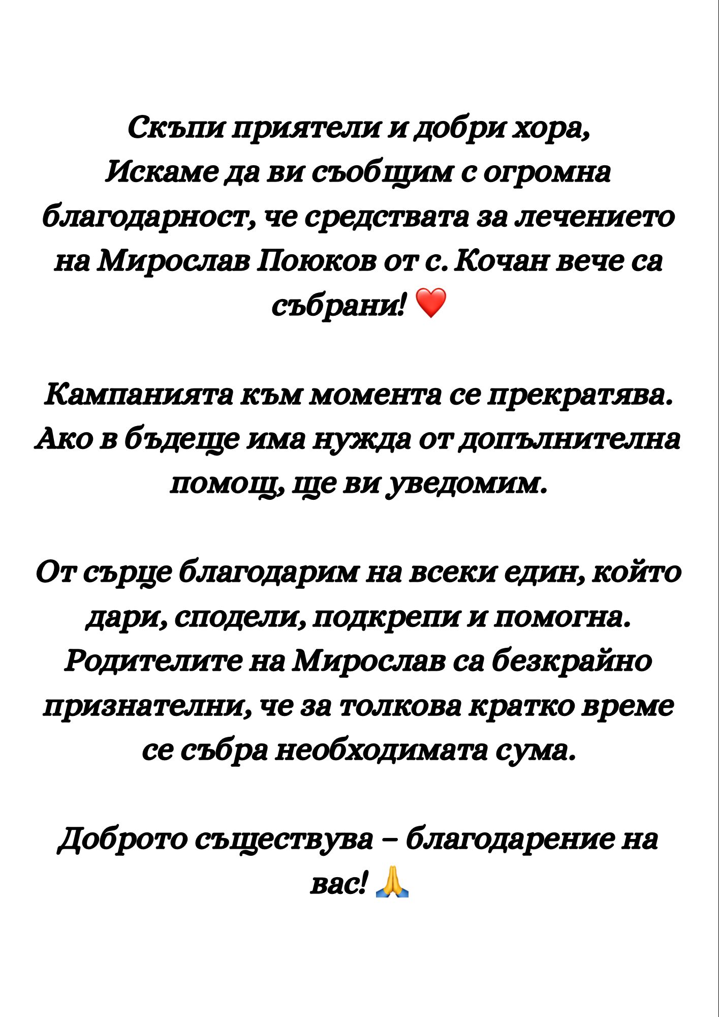 „От сърце благодарим на всеки един, който дари, сподели, подкрепи и помогна,“ споделят родителите на Мирослав, чиито сърца днес туптят с една идея по-спокойно. Те са безкрайно признателни, че в най-мрачния им час, цялата общност протегна ръка и не ги остави сами в битката за живота на сина им.