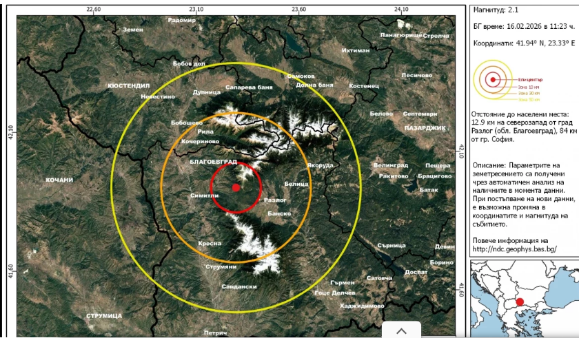 Земетресение е регистрирано в Благоевградско, показват данните на Националния институт по геофизика, геодезия и география към БАН. По информация на специалистите трусът е с магнитуд 2.1 по скалата на Рихтер и не се очаква да е причинил материални щети или да е усетен осезаемо от населението.