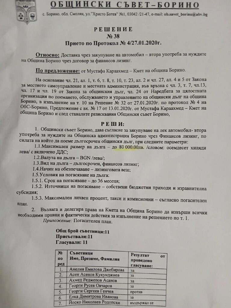 „Топ Преса“ се добра до Решение №38 (Протокол №4), което разкрива как се източват публични средства под маската на „нуждите на администрацията“. По предложение на самия Караахмед, общината поема дългосрочен дълг за покупка на лек автомобил – втора употреба.