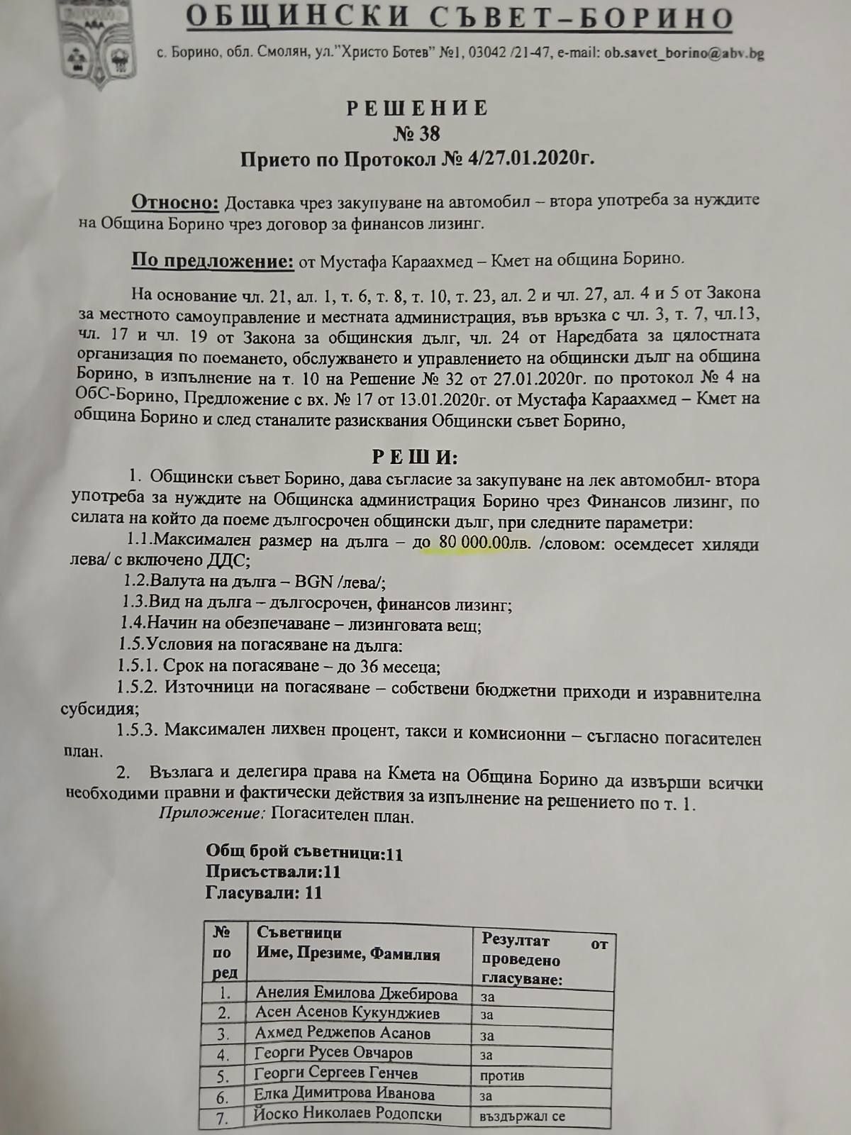 За да знае народът кои са хората, вдигнали ръка за този харч, публикуваме списъка от протокола. От 11 присъстващи съветници, мнозинството е гласувало „ЗА“ заробването на общината с дълг за луксозната играчка на кмета:
