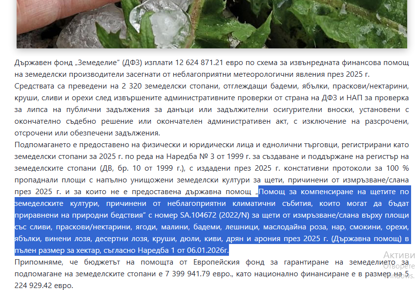 ВНИМАНИЕ В ДЕТАЙЛИТЕ! Прочитът на текста на ДФЗ разкрива скандална селекция. Подпомагането е насочено ЕДИНСТВЕНО към стопани, отглеждащи сливи, праскови/нектарини, ягоди, малини, бадеми, лешници, маслодайна роза, нар, смокини, орехи, ябълки, винени лозя, десертни лозя, круши, дюли, киви, дрян и арония през 2025 г. Става дума за щети от „измръзване и слана“.
