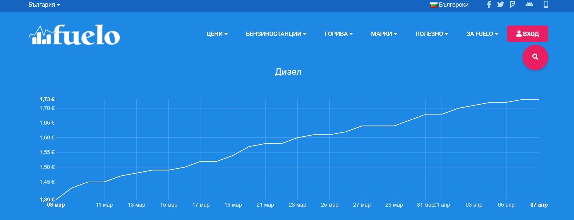 За последния месец дизелът е поскъпнал с 0,34 €/л (24,46%) с тенденция на поскъпване