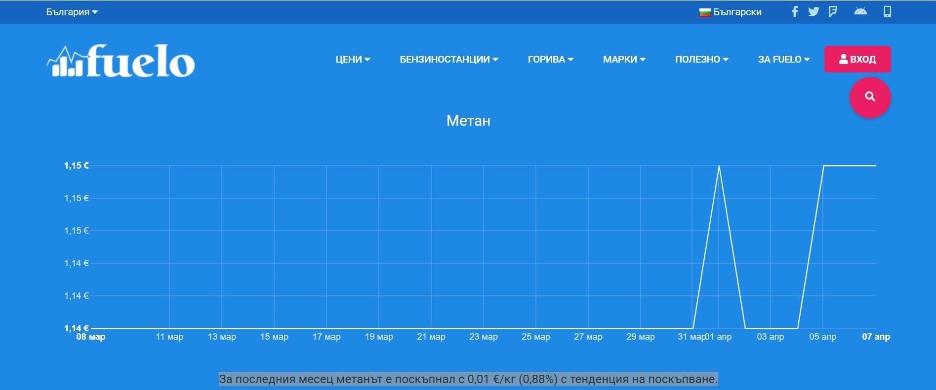 • За последния месец метанът е поскъпнал с 0,01 €/кг (0,88%) с тенденция на поскъпване