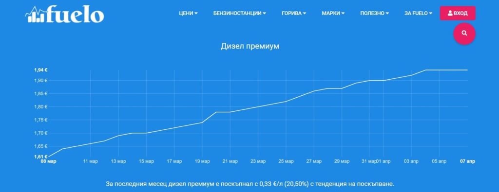 За последния месец дизел премиум е поскъпнал с 0,33 €/л (20,50%) с тенденция на поскъпване