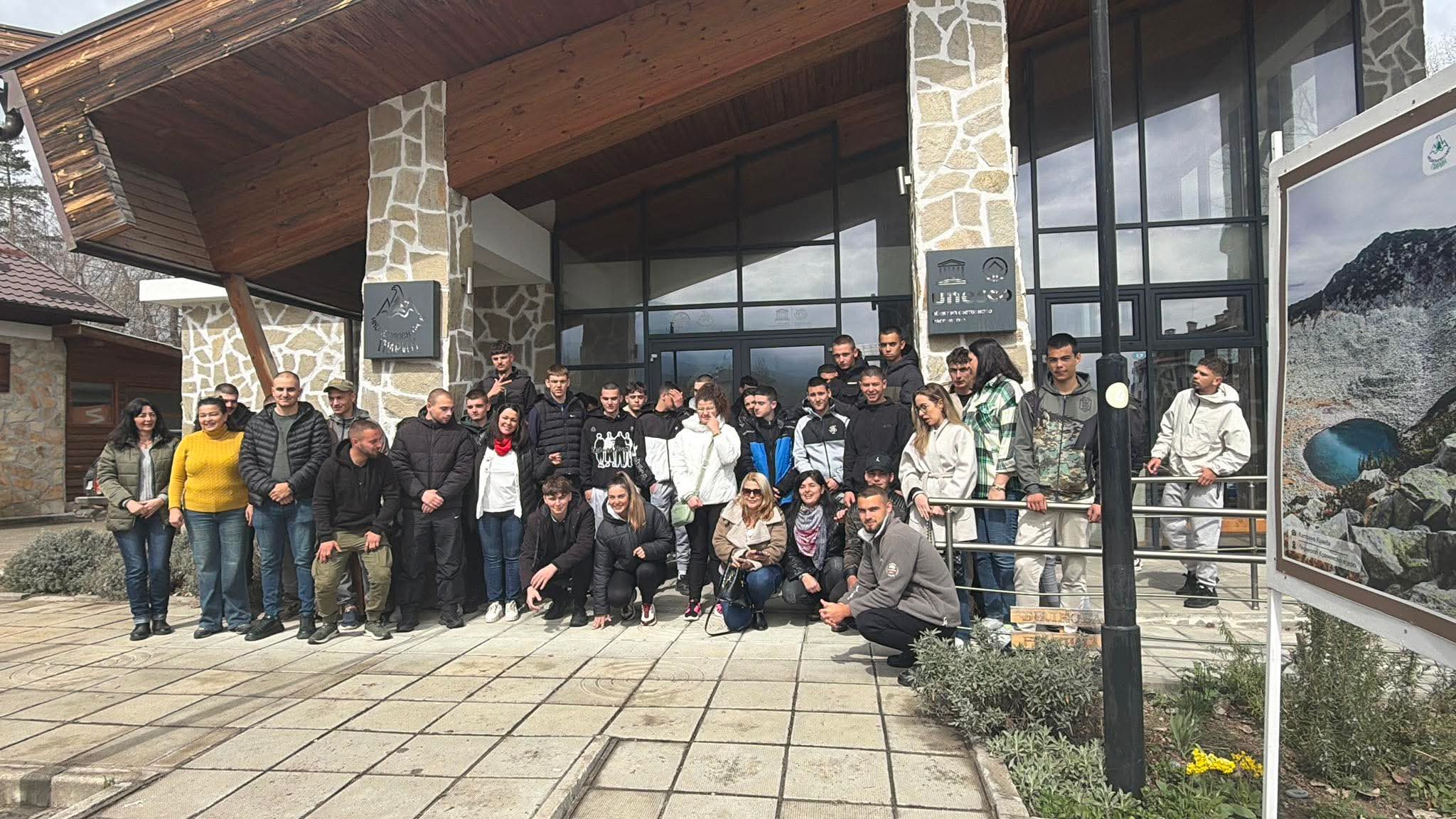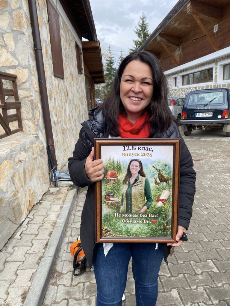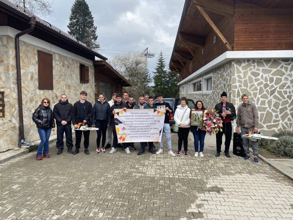 Младите хора от специалност „Горско и ловно стопанство“ избраха символично място за тази емоционална среща – Посетителски информационен център на НП „Пирин“. Там, сред красотата на природата, те посрещнаха своята любима учителка с необичаен и запомнящ се ритуал – под звуците на автентична гайда и… бензиномоторни триони, които подчертаха професионалната им насоченост и чувство за хумор.