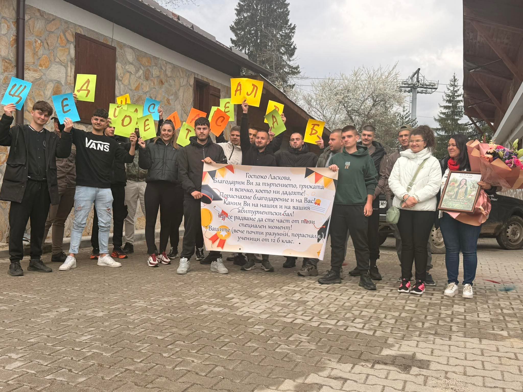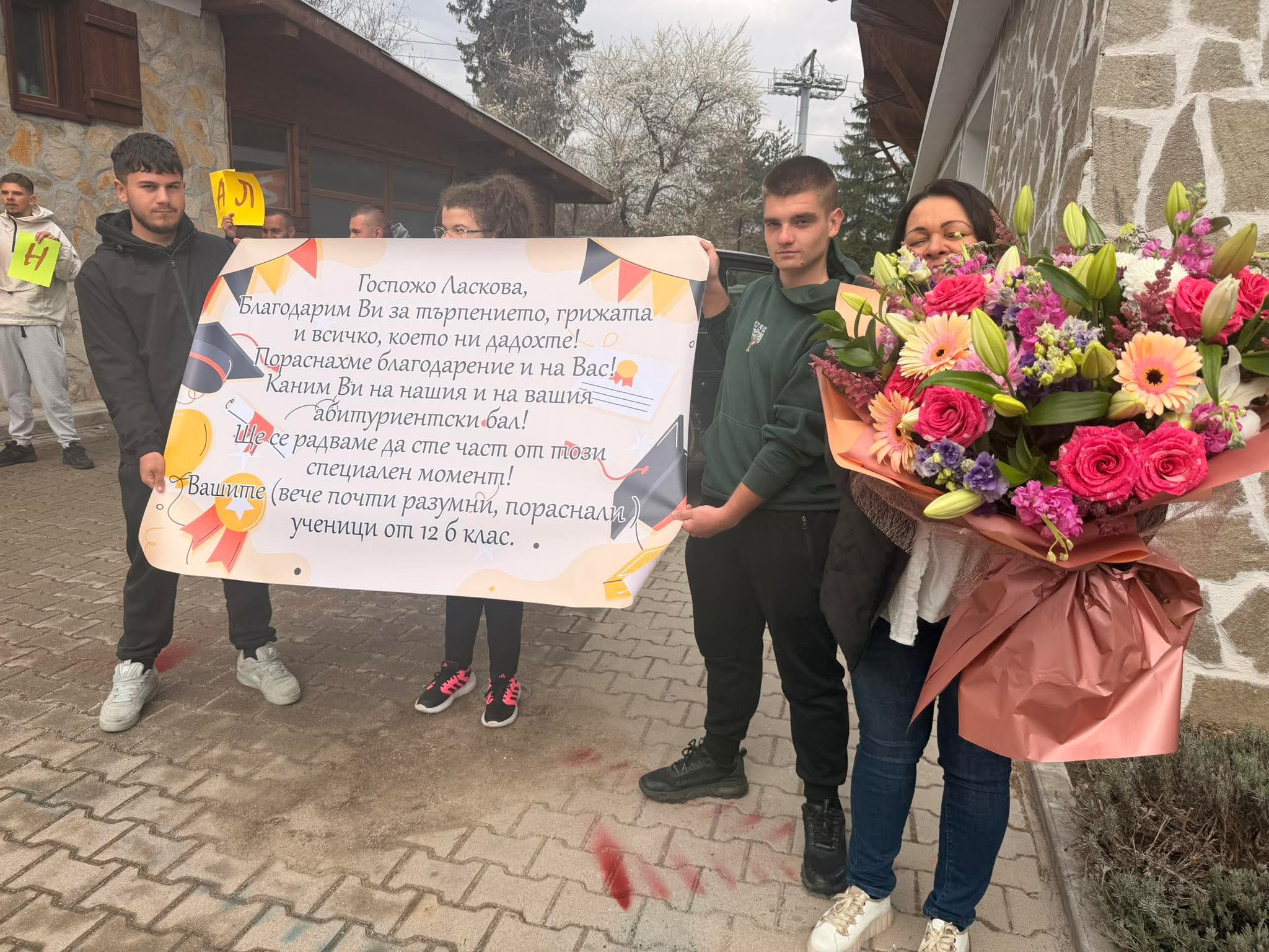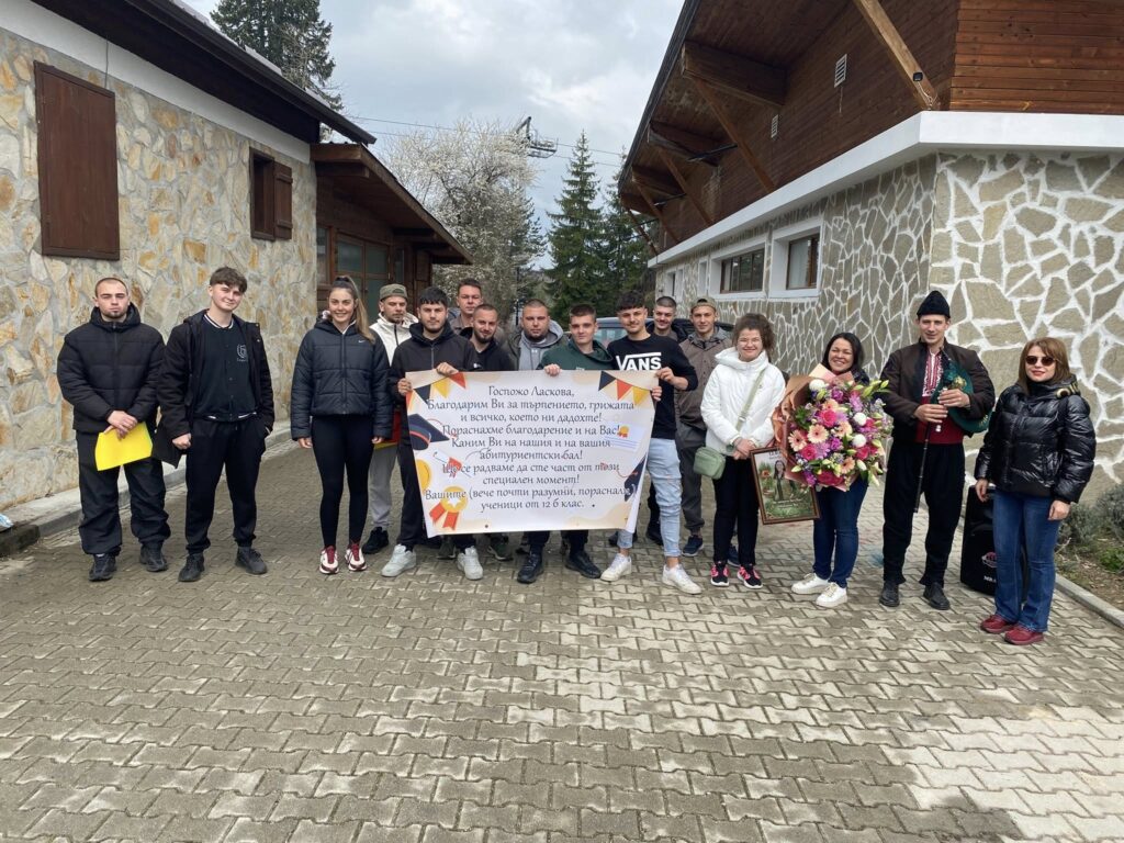 Кулминацията на събитието настъпи, когато дванадесетокласниците поднесоха на г-жа Ласкова огромен букет, специален подарък и впечатляващ плакат, изпълнен с думи на благодарност и обич. Всяко послание разкриваше признателността им за грижите, подкрепата и вдъхновението, които тя им е давала през изминалите пет години.
