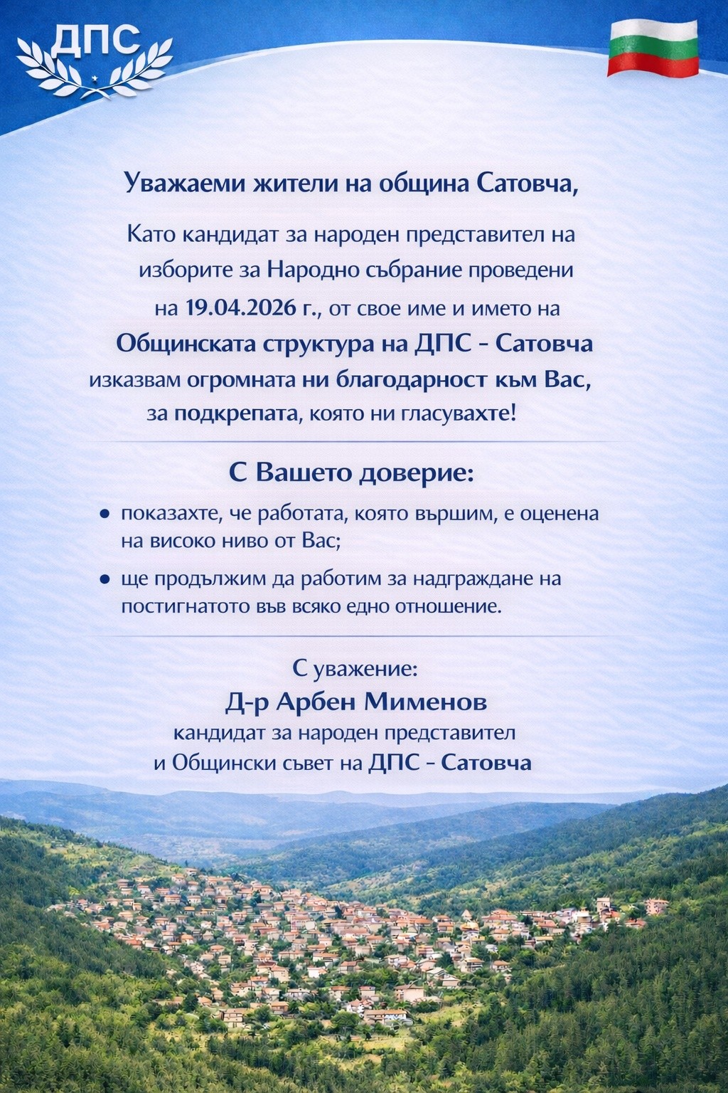 В емоционално обръщение към своите съграждани, д-р Арбен Мименов изрази своята дълбока признателност за категоричната подкрепа, получена на парламентарните избори, проведени на 19 април 2026 г. Община Сатовча за пореден път доказа своята сплотеност, гласувайки доверие на досегашния модел на управление и визия за бъдещето.