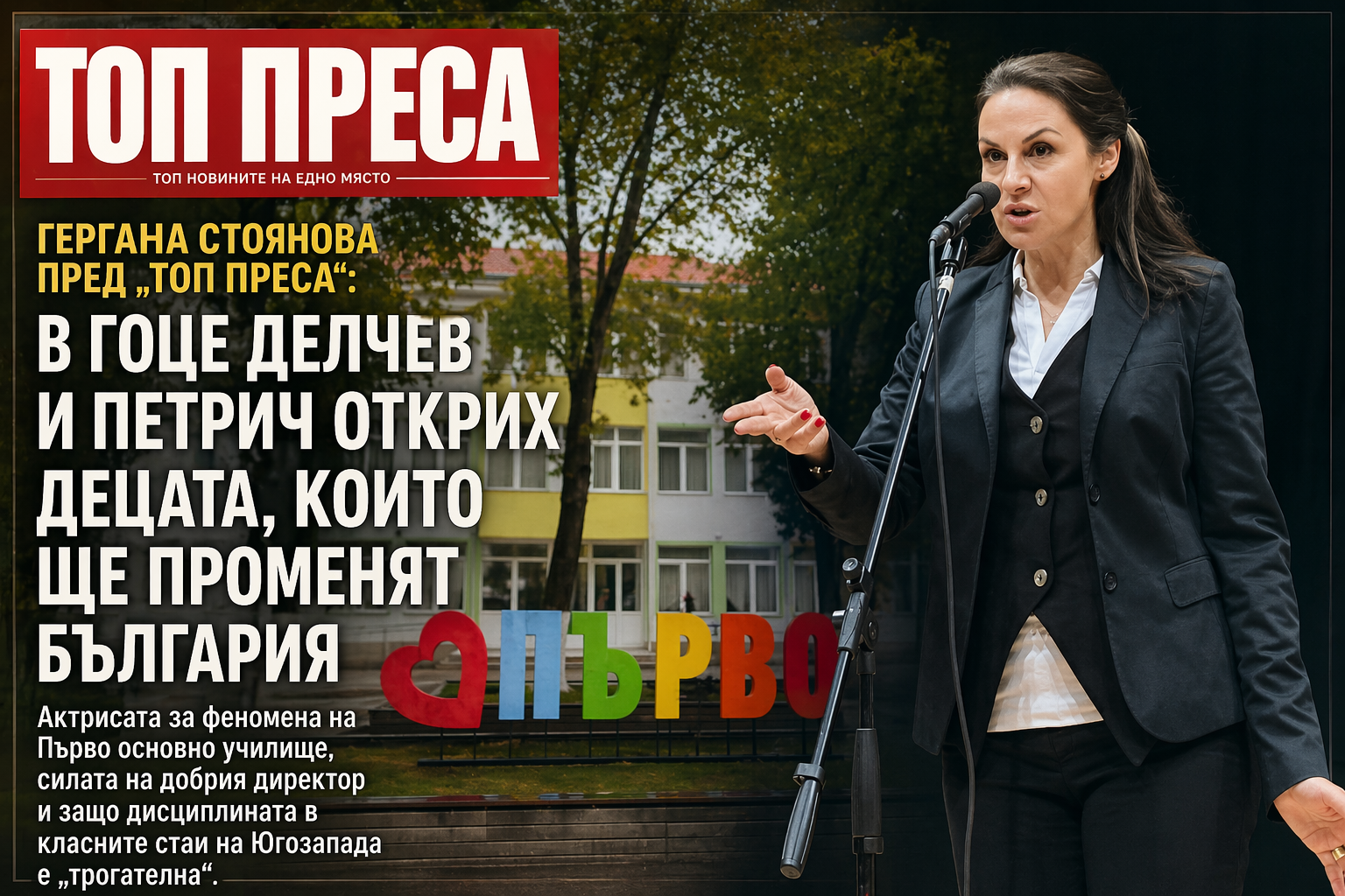 Срещата с Гергана Стоянова винаги прилича на внезапен прилив на чист въздух в стая, която твърде дълго е стояла затворена. Тя не влиза просто в пространството, тя го превзема с онази особена, почти магнетична енергия, която сме свикнали да чуваме в гласа ѝ от екрана или да виждаме в десетките ѝ превъплъщения на сцената. Но когато я потърсихме от „Топ Преса“, породени от нейните откровени думи за училищата в нашия край, пред нас не застана просто звездата, а човекът с мисия. Оказа се, че Гоце Делчев и Петрич не са били просто точки от турне, а места на истинско духовно съприкосновение. Гергана говори бързо, с плам, който не може да бъде симулиран, и с онази непримиримост на духа, която я кара да пропътува стотици километри през дъжд и вятър, за да погледне в очите едно дванадесетгодишно дете и да му каже, че то може повече.