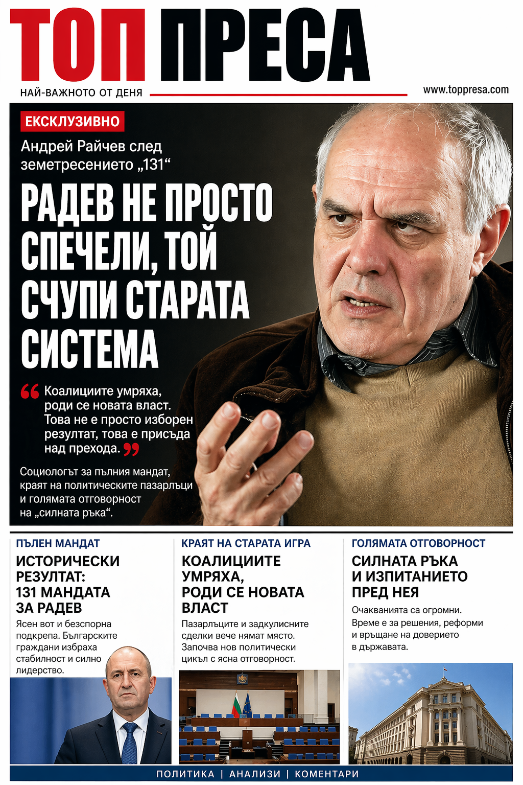ЕКСКЛУЗИВНО В ТОП ПРЕСА: Андрей Райчев след земетресението „131“ – Радев не просто спечели, той счупи старата система