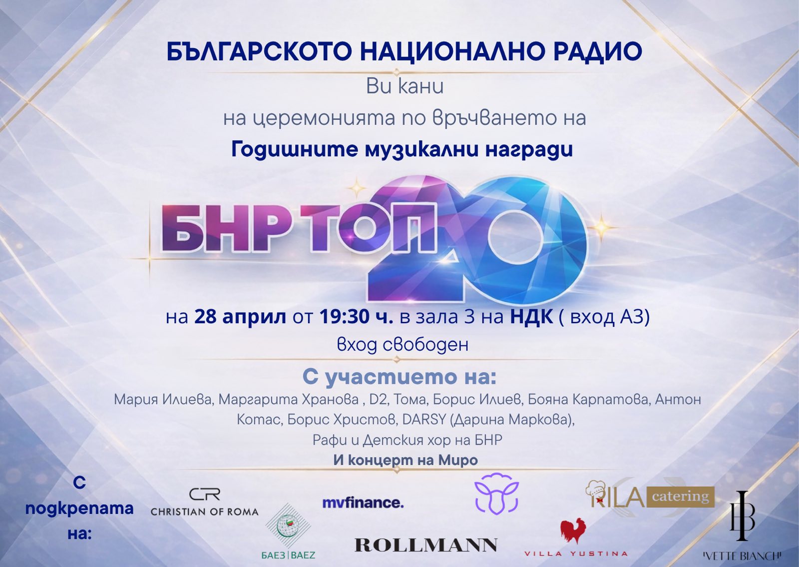 На церемонията ще бъдат връчени отличия в общо шест категории, а на сцената ще излязат едни от най-обичаните и популярни изпълнители в България – Мария Илиева, Маргарита Хранова, D2, Тома, Борис Илиев, Бояна Карпатова, Борис Христов, Антон Котас, DARSY (Дарина Маркова), Рафи и Детския радиохор. Събитието ще завърши с концерт на Миро.