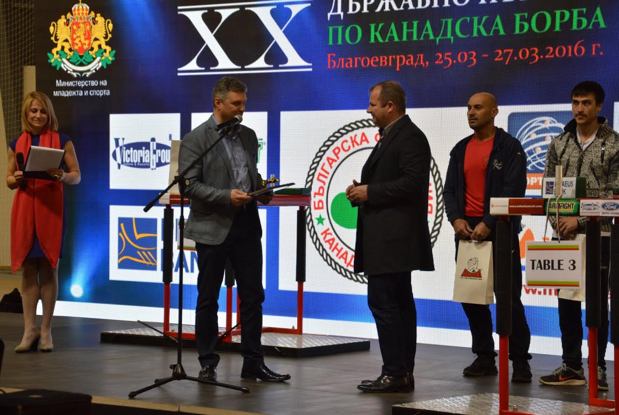 В знак на благодарност, за подкрепата на спорта и в Държавното първенство, председателят Федерация по канадска борба Асен Хаджитодоров връчи почетен плакет на Община Благоевград. „Благоевград е един от бастионите на канадската борба. Това е основната причина XX юбилейно състезание да се именно проведе тук“, каза Асен Хаджитодоров. Почетни плакети получиха още многократните шампиони по канадска Борба Цветан Кашевски, Георги Гайдарджиев, както и спонсори.