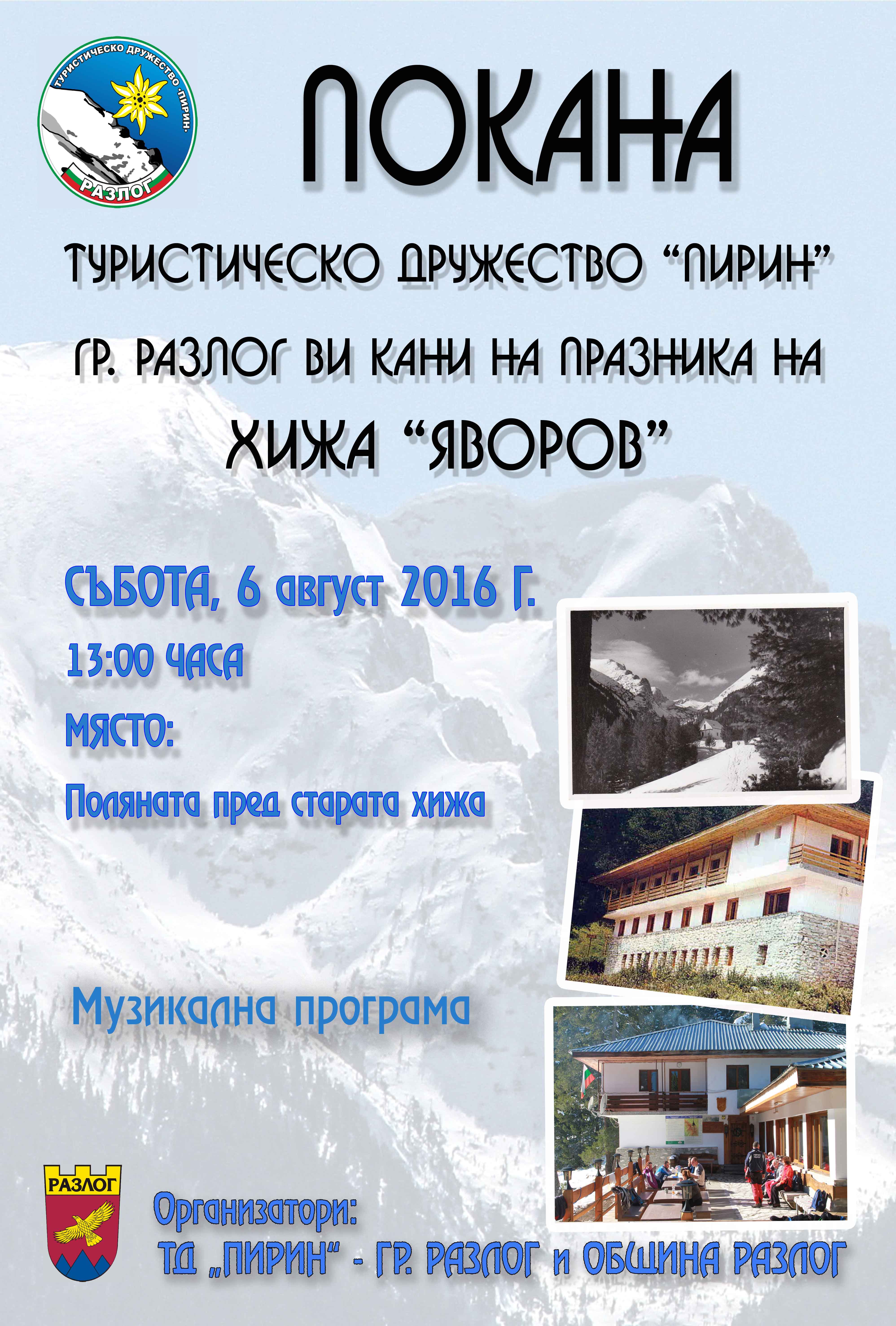 На 6 август ще се проведе и празникът на хижа „Яворов“, който ще започне в 13.00 ч. в подножието на „Събиците“/поляната пред старата хижа/ и ще премине под звуците на обичани разложки и македонски песни.