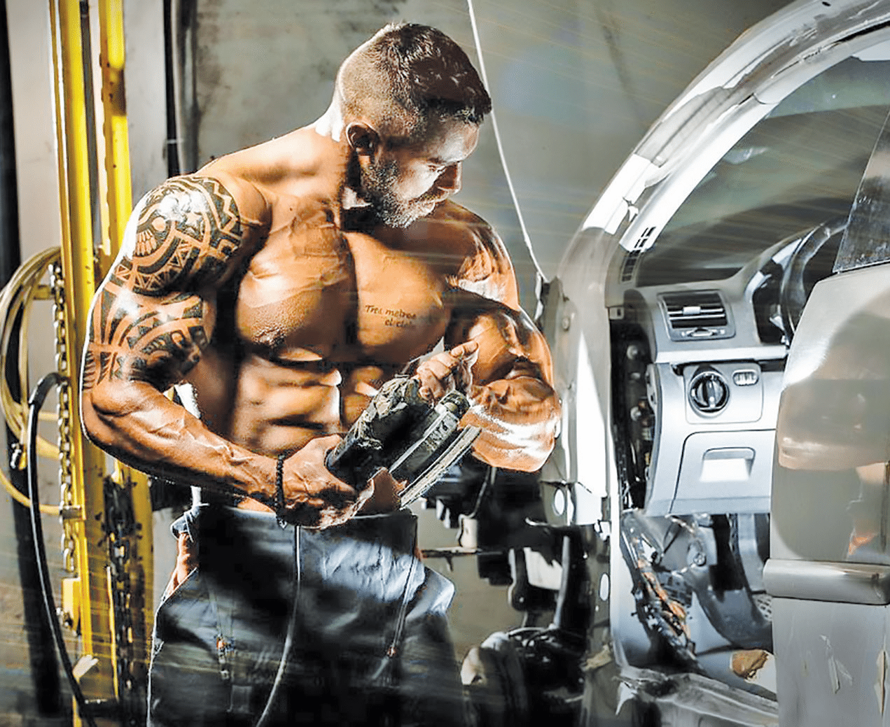 Дудов позира като автомонтьор с чук и шлайф в ръка.
