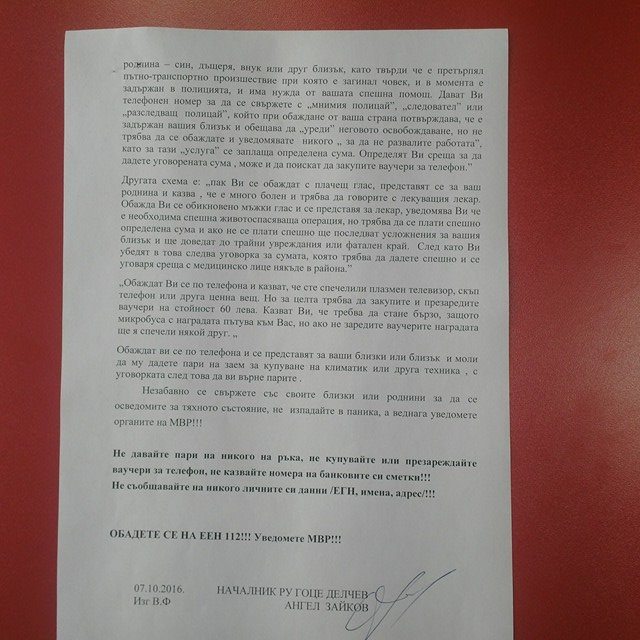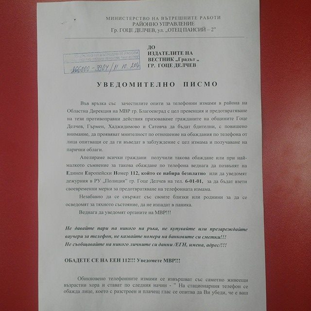 Уведомително писмо във връзка със зачестилите опити за телефонни измами в района