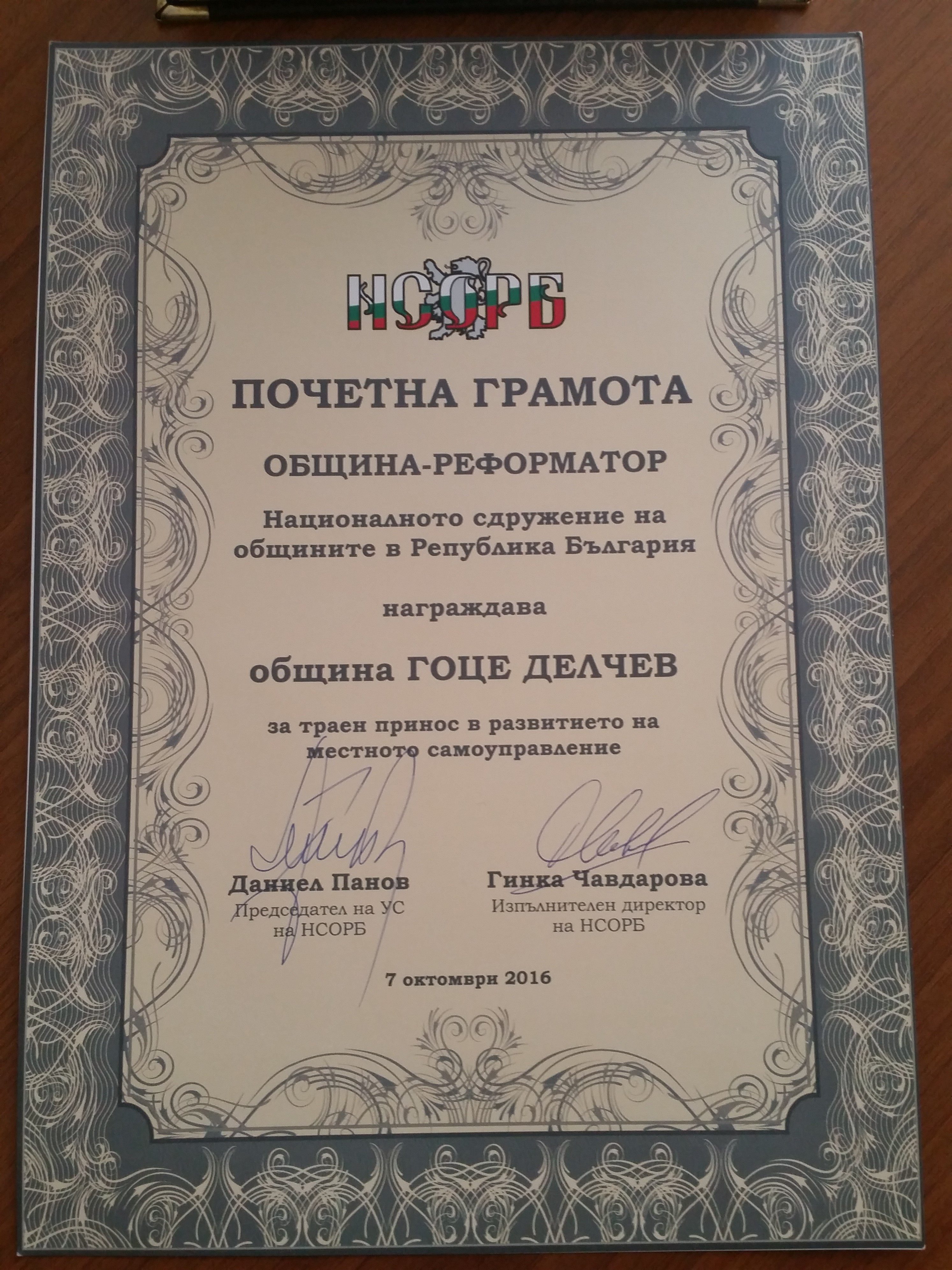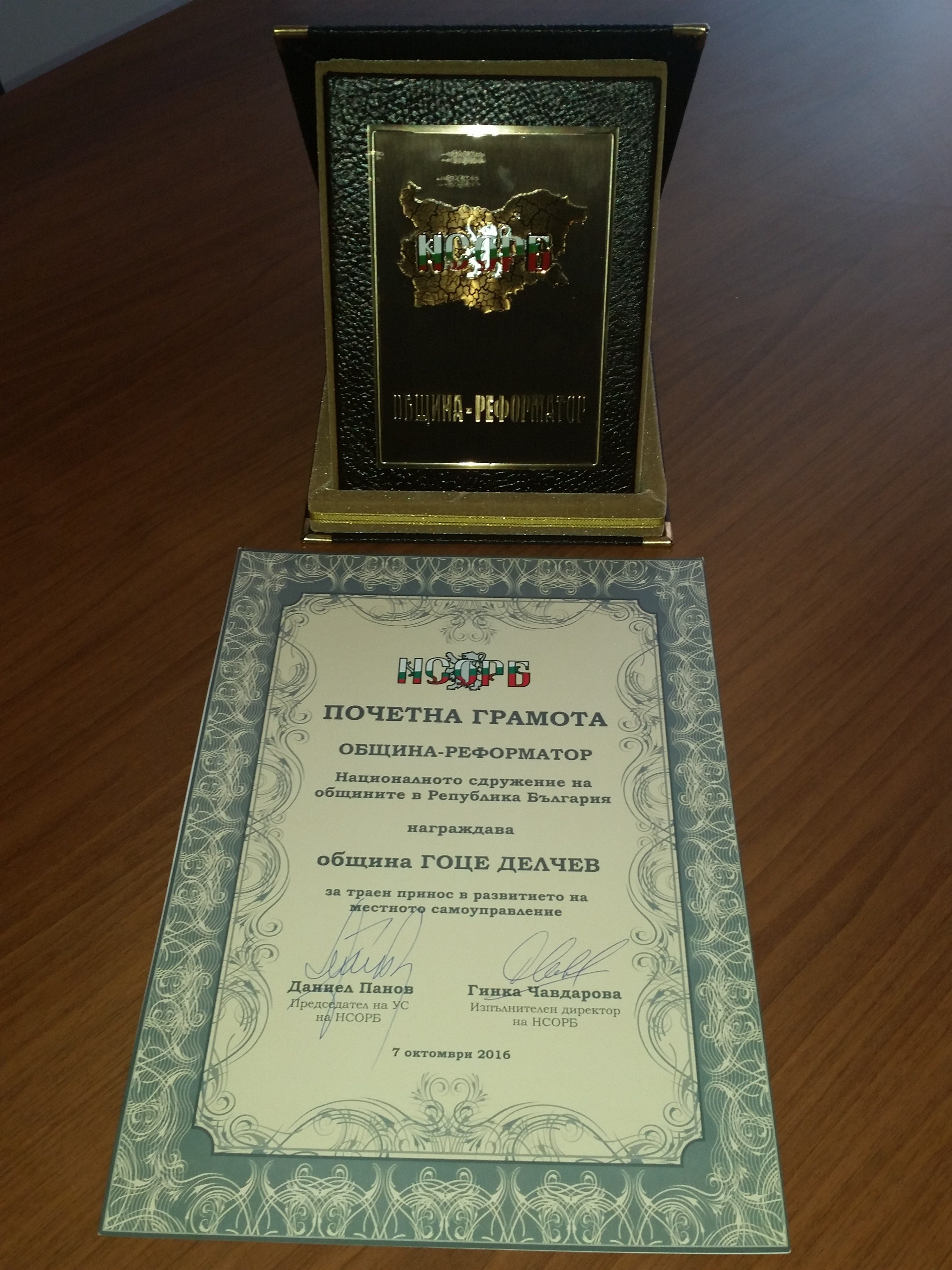 Почетната грамота и плакетът „ОБЩИНА – РЕФОРМАТОР“, са поредната положителна оценка за община Гоце Делчев, която е още по-ценна, тъй като бе връчена в навечерието на празника на града.