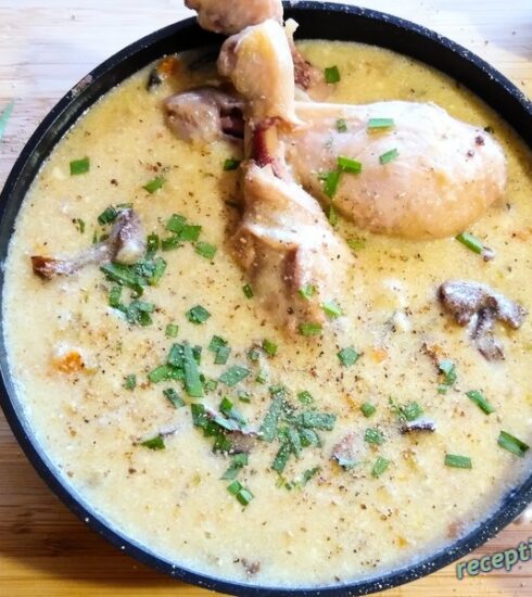 Продукти: 4 пилешки бутчета, 250 г гъби печурки, 1 малка глава лук, 2 скилидки чесън, 150 мл сухо бяло...