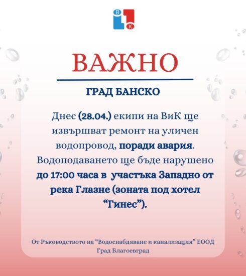 Важно съобщение до жителите и гости на град Банско! Поради авария на сградно водопроводно отклонение на ул. „Пирин“, в...